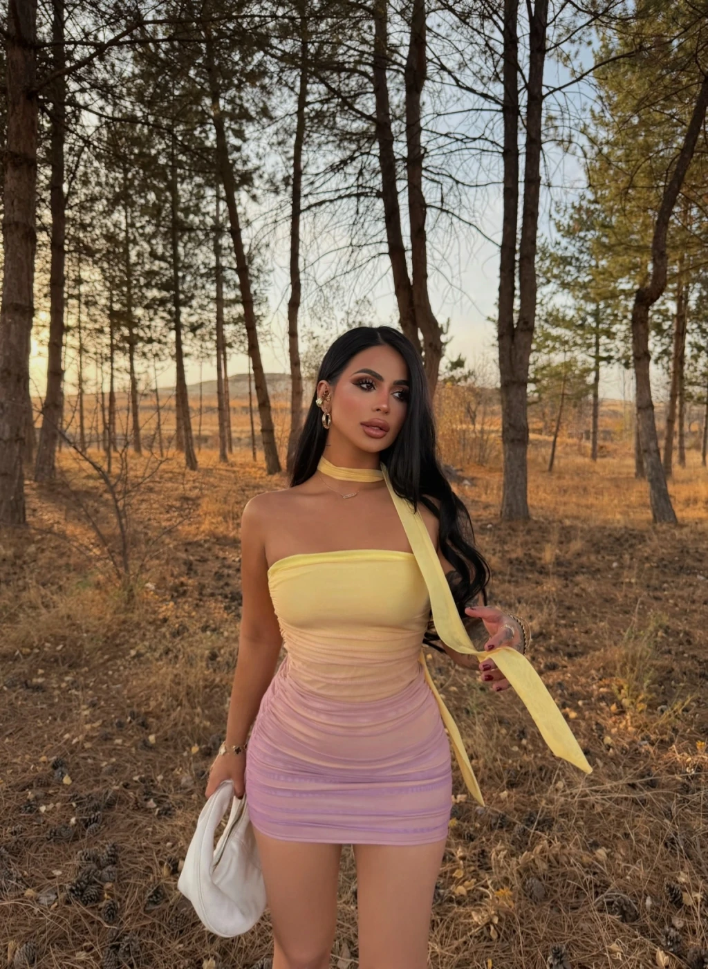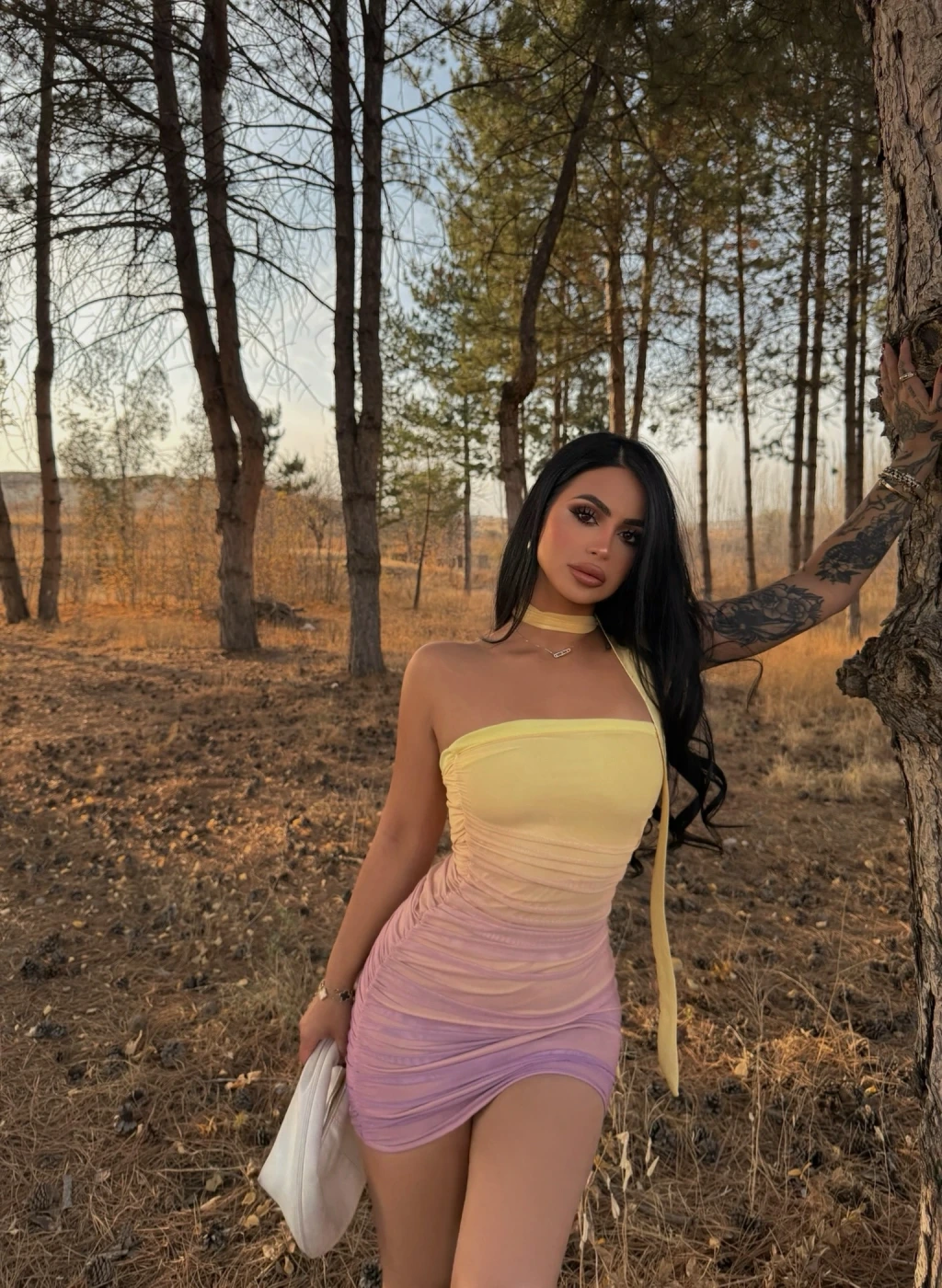 Renk Geçişli Fularlı Elbise ile tarzınızı ve şıklığınızı ön plana çıkarabilir, her davette göz kamaştırabilirsiniz.