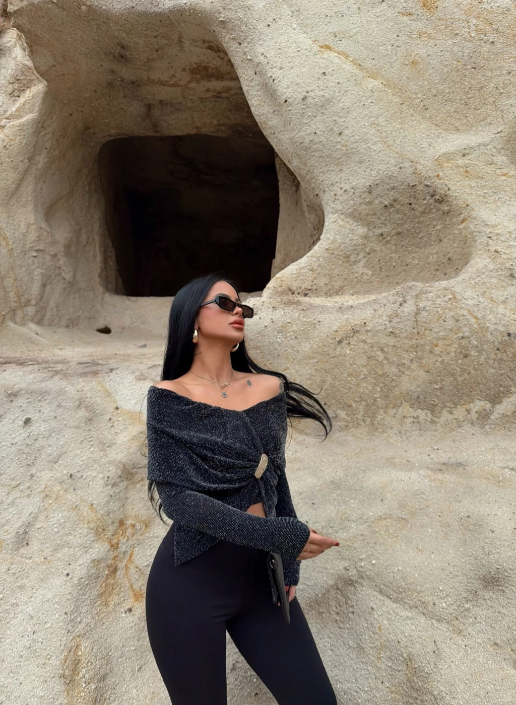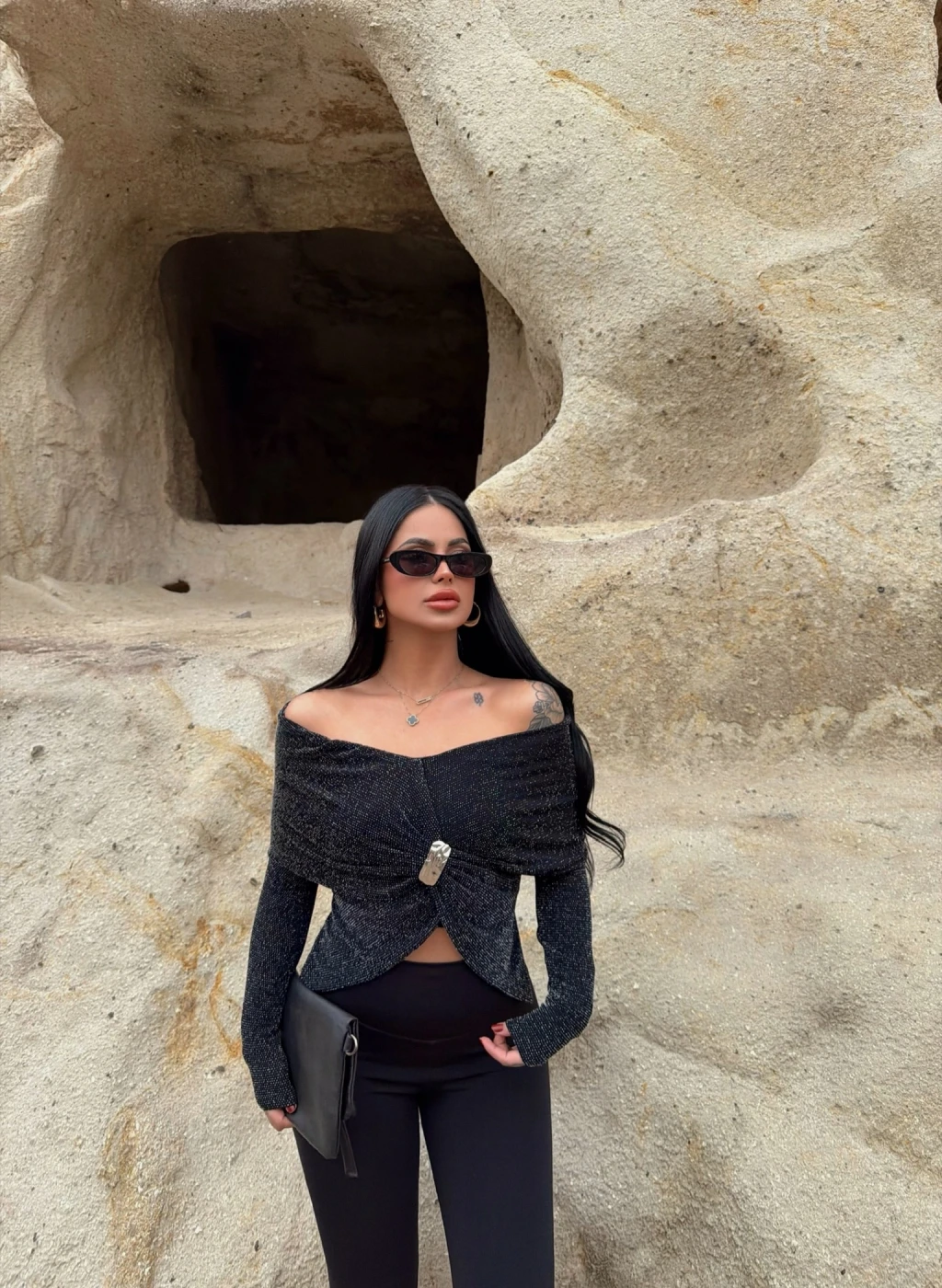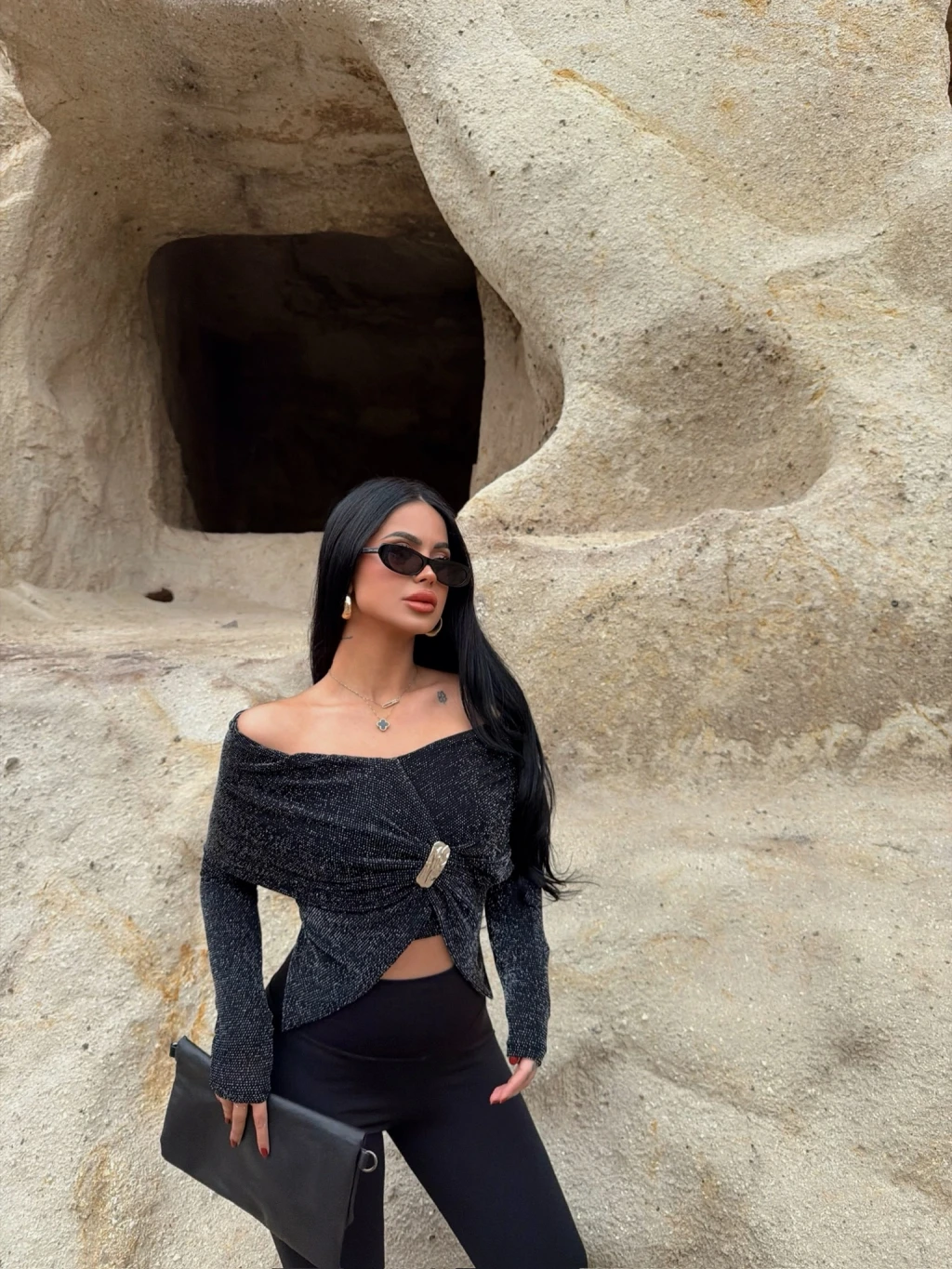 Simli Madonna Şal Bluz, tarzınızı yansıtacak şık bir seçenektir.