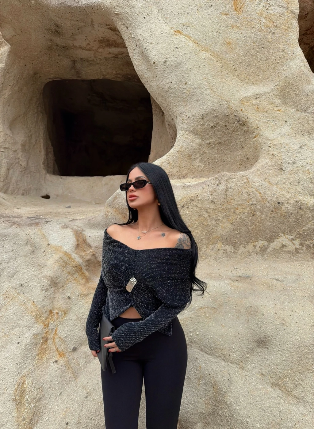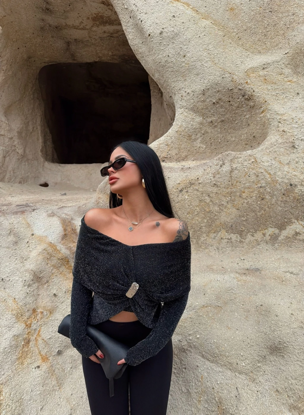 Bu eşsiz bluz ile her ortamda kendinizi özel hissedeceksiniz. Tarzınızı yansıtmak ve şıklık kazanmak için Simli Madonna Şal Bluz'u tercih edebilirsiniz.