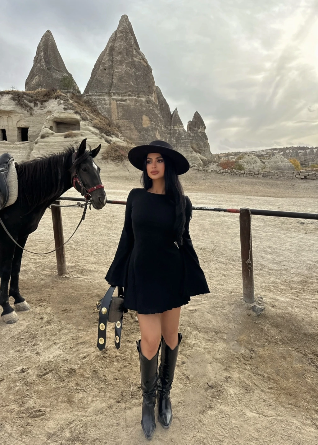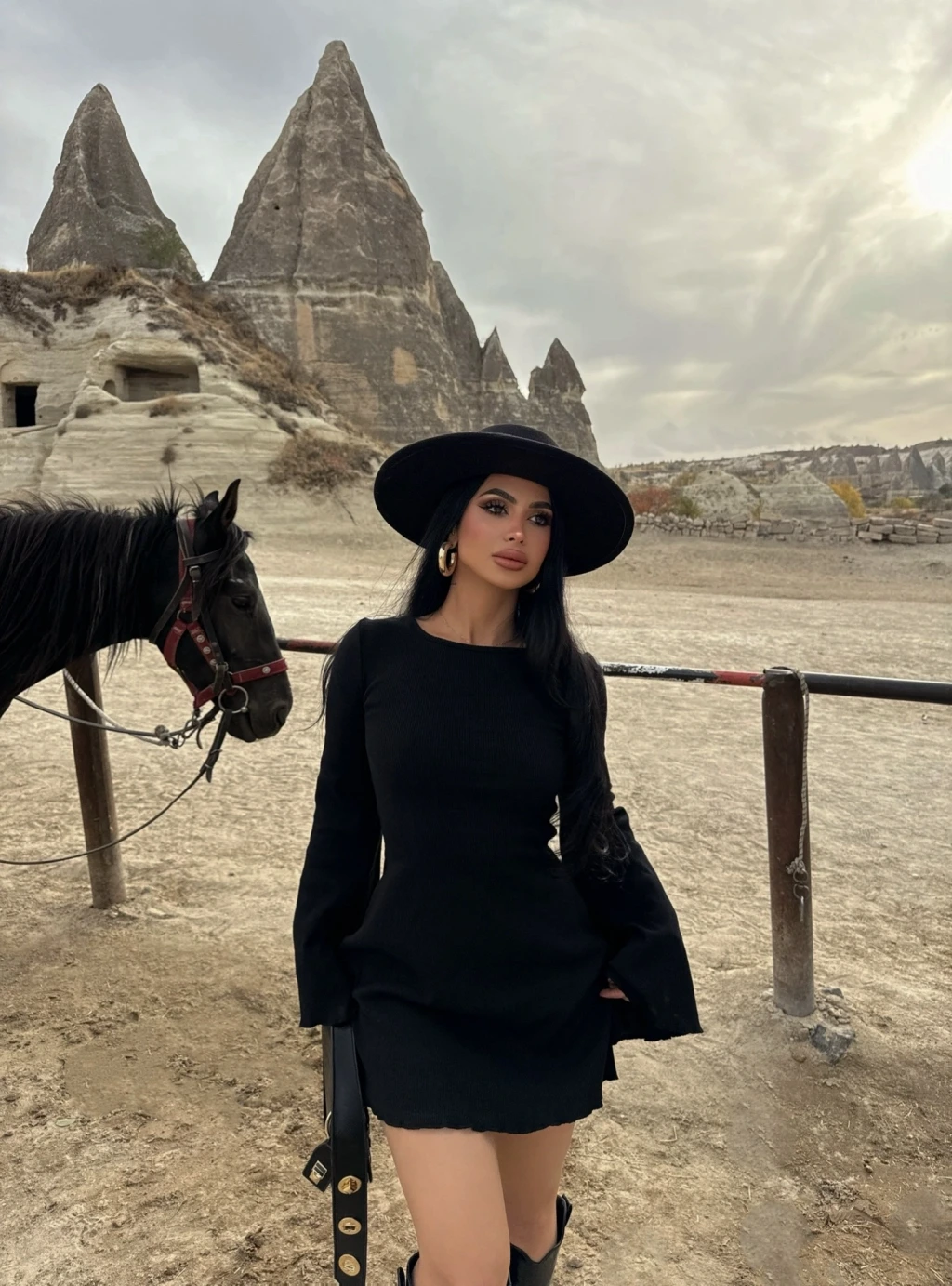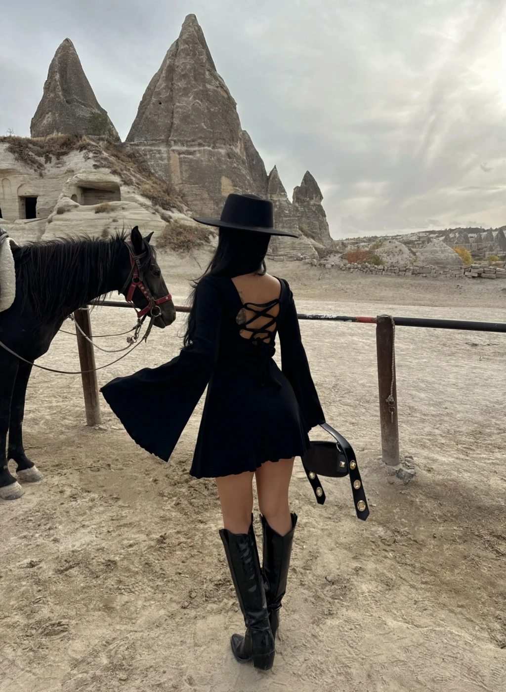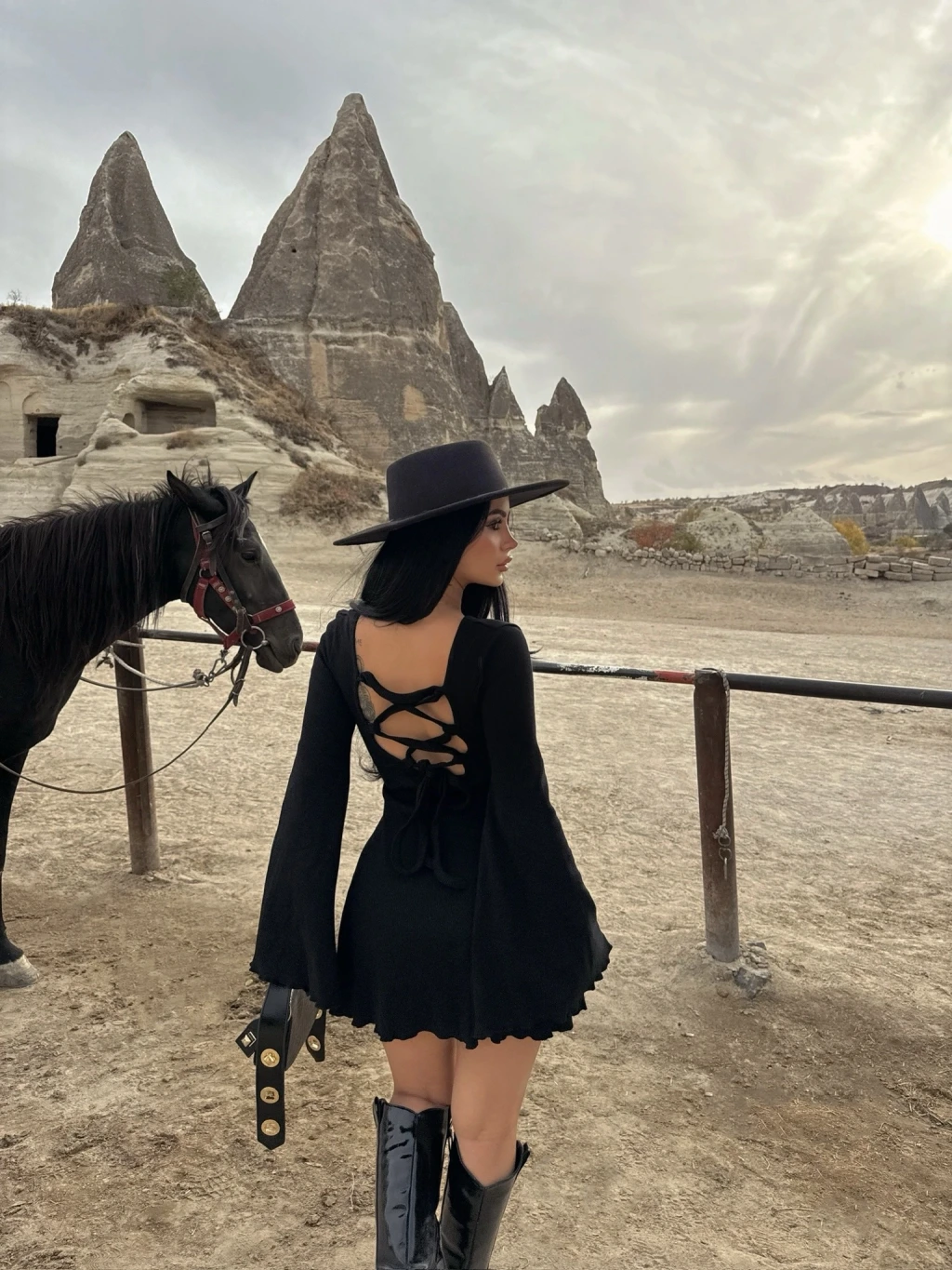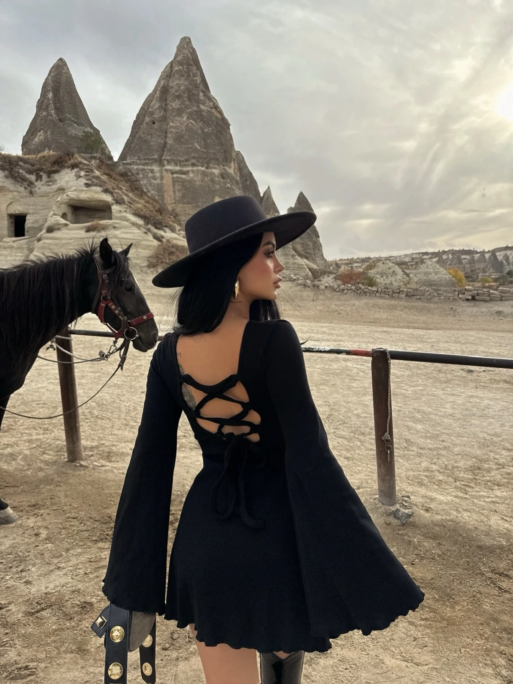 Sırt dekoltesi ve volan detayıyla büyüleyici bir görünüm sunar.