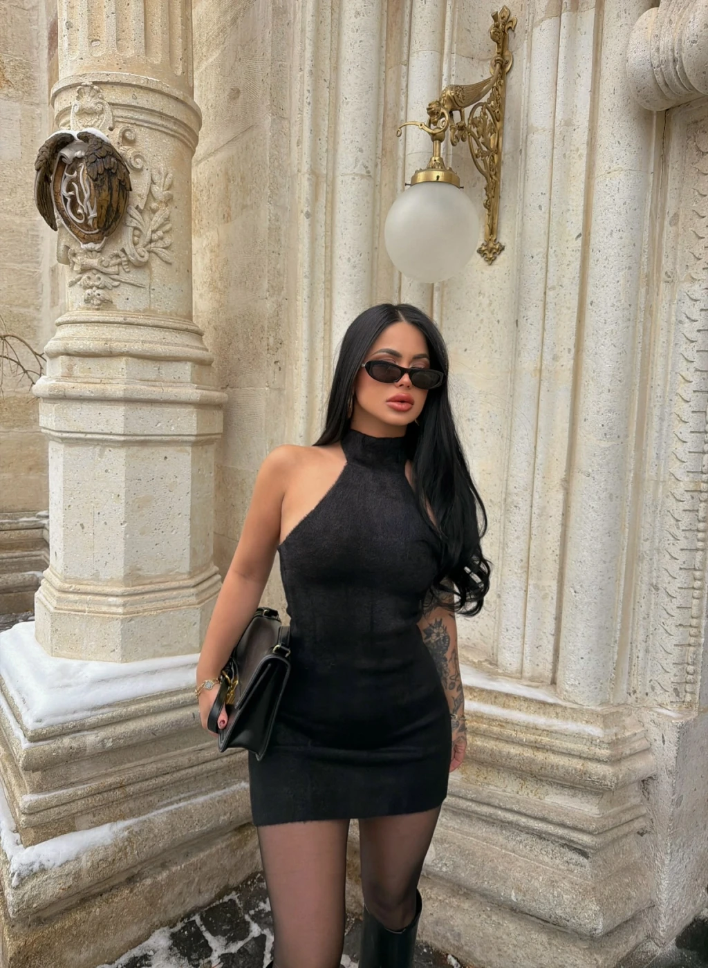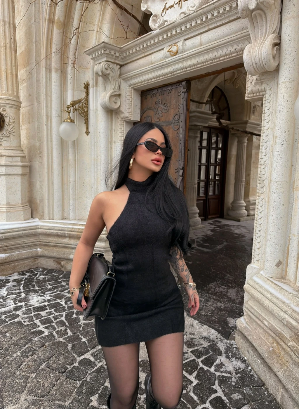 Siyah Boyundan Geçmeli Sakallı Elbise