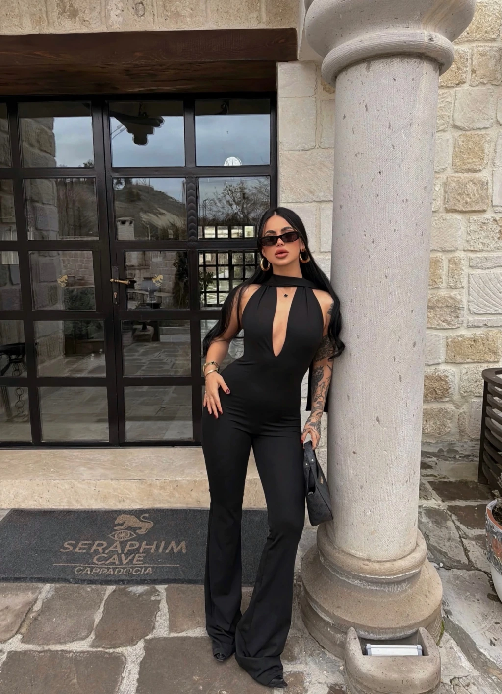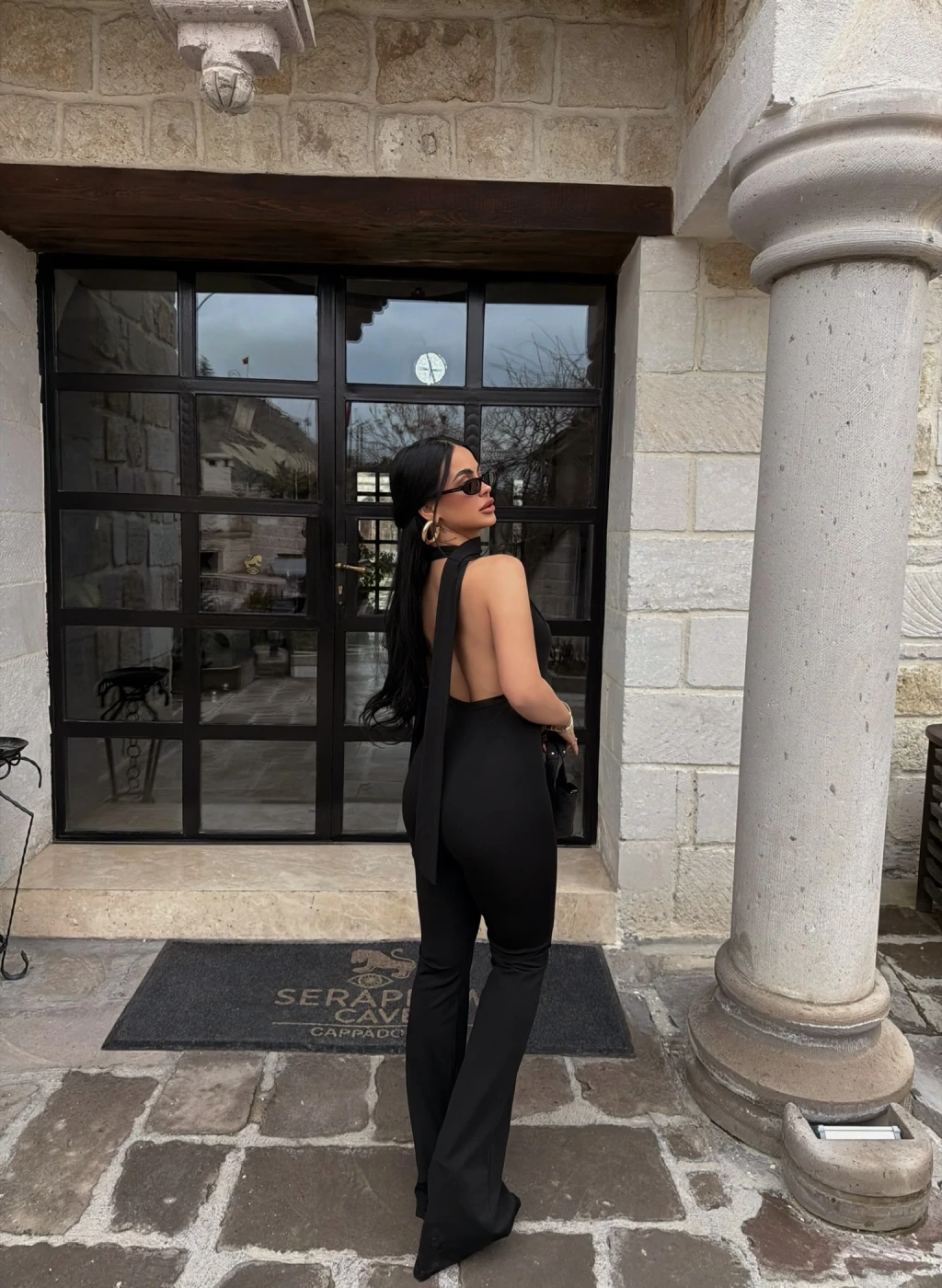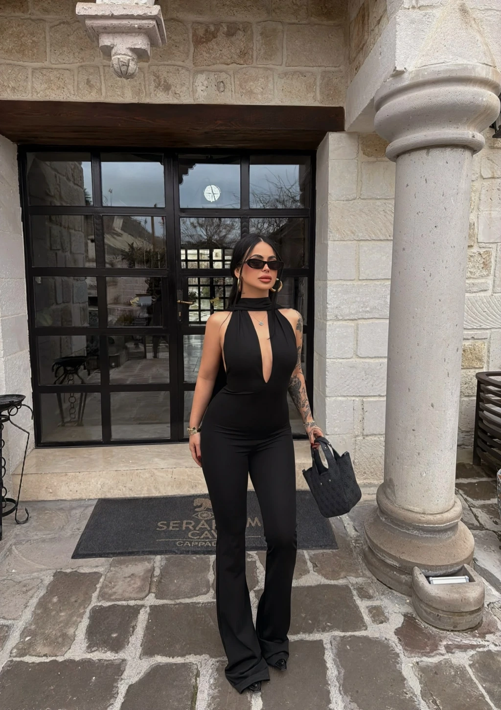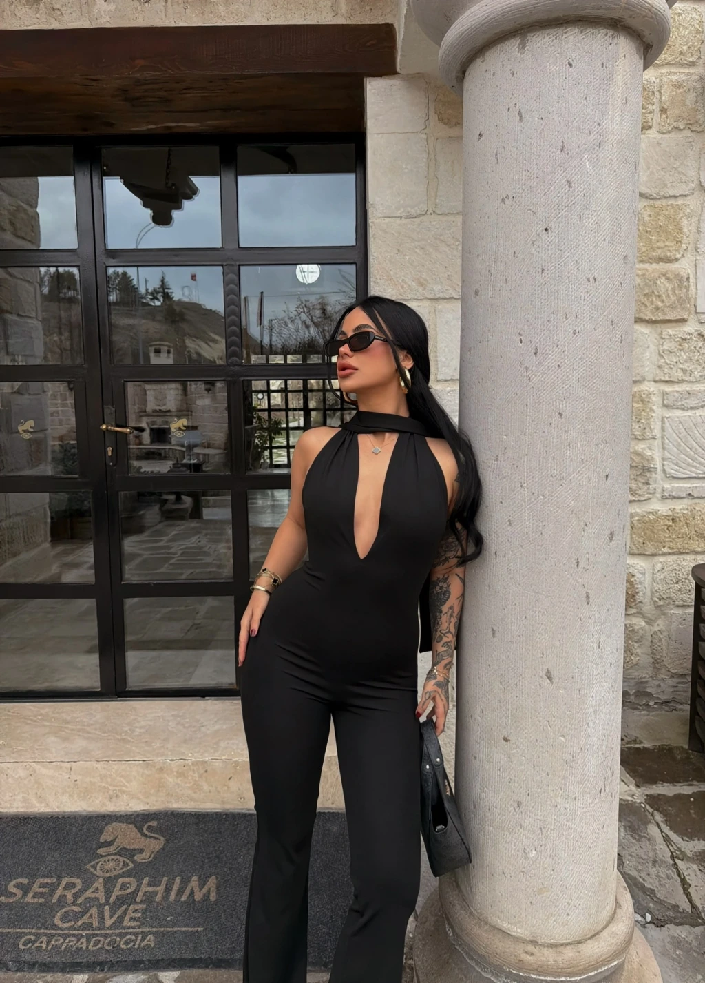 Siyah Boyundan Geçmeli Toparlayıcı Tulum