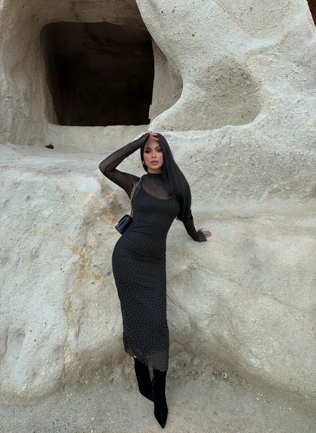 Siyah Dik Yaka Astarlı Taşlı Elbise