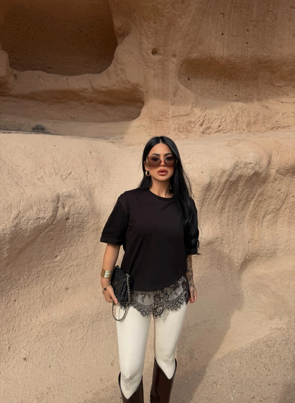 Siyah Eteği Güpürlü Basic Tişört