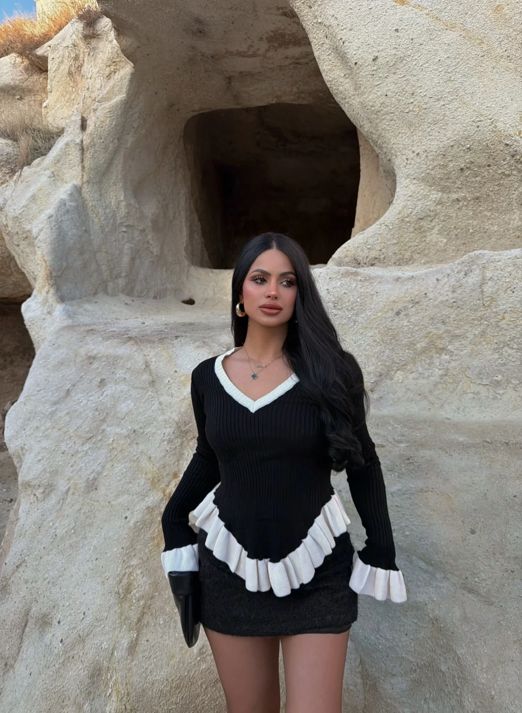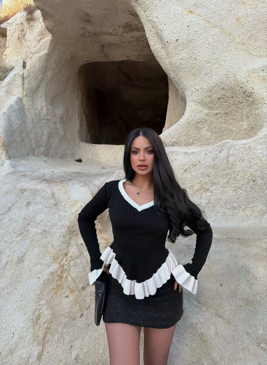 Siyah Fırfırlı Fitilli Kazak
