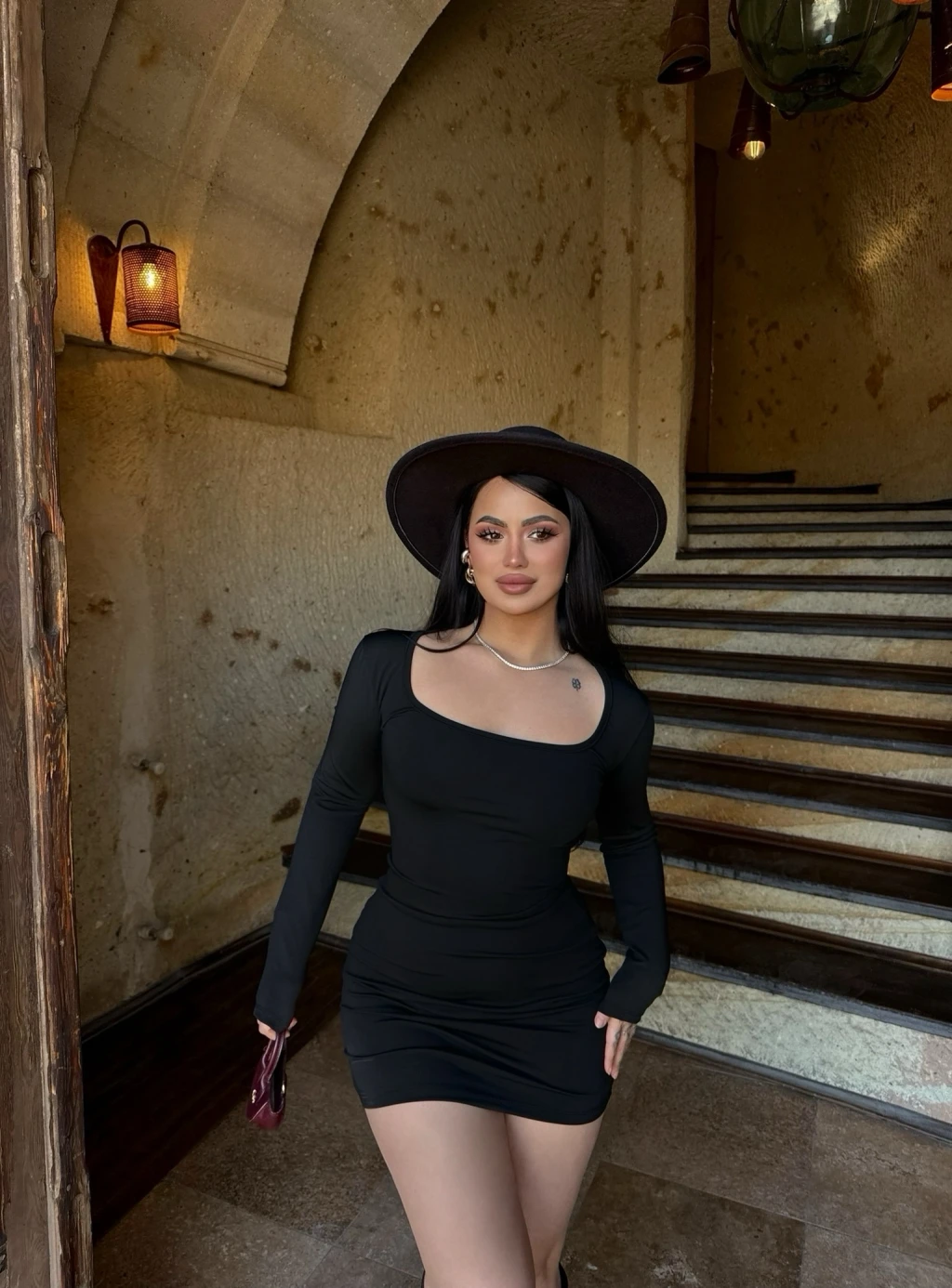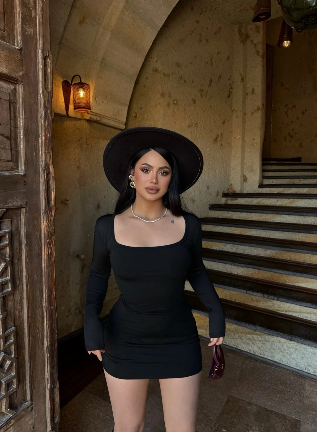 Üst kısmı kare yaka detayıyla dikkat çeken elbise, vücuda oturan tasarımıyla feminin bir görünüm kazandırır.