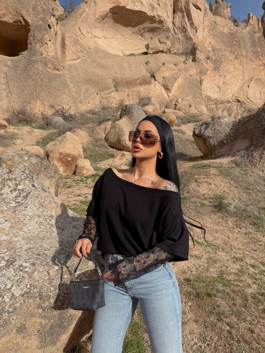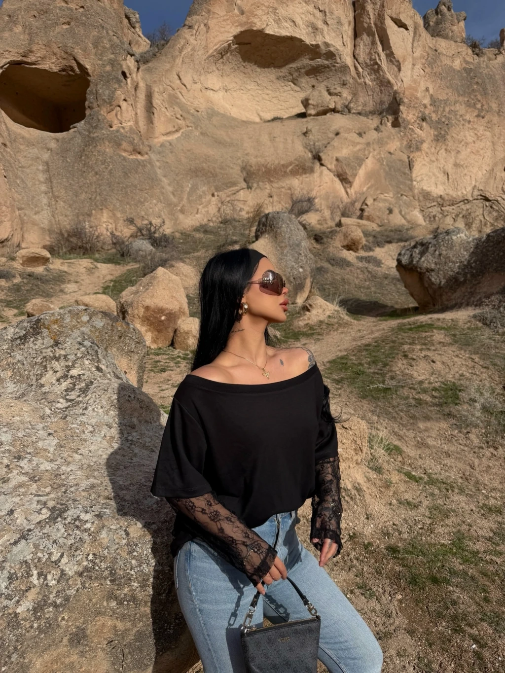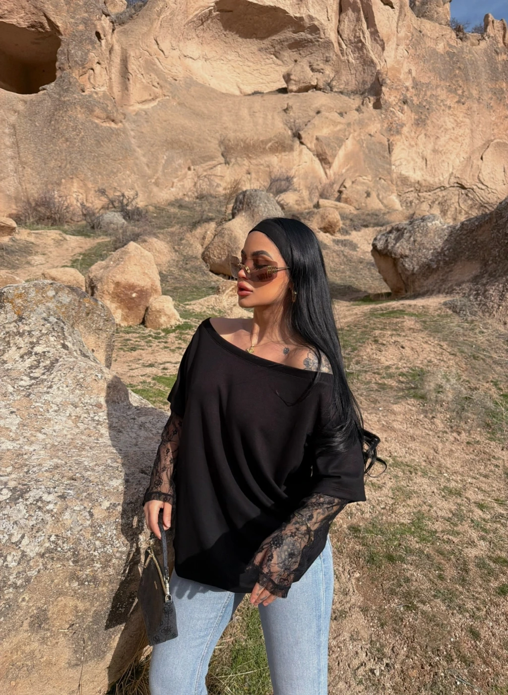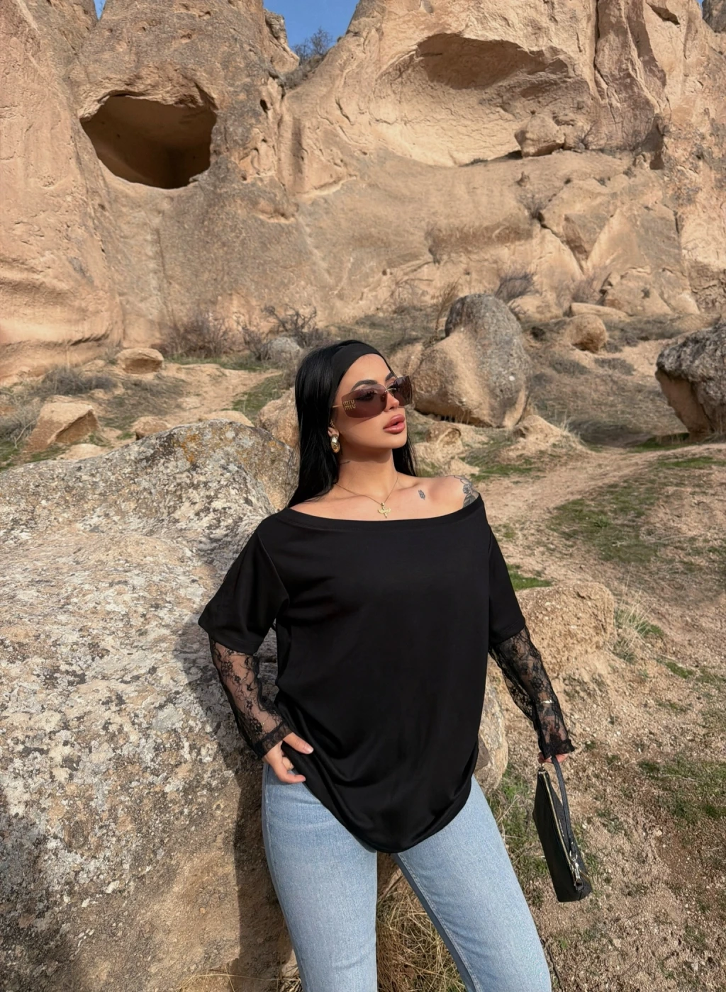 Siyah Kayık Yaka Kolları Güpürlü Tişört