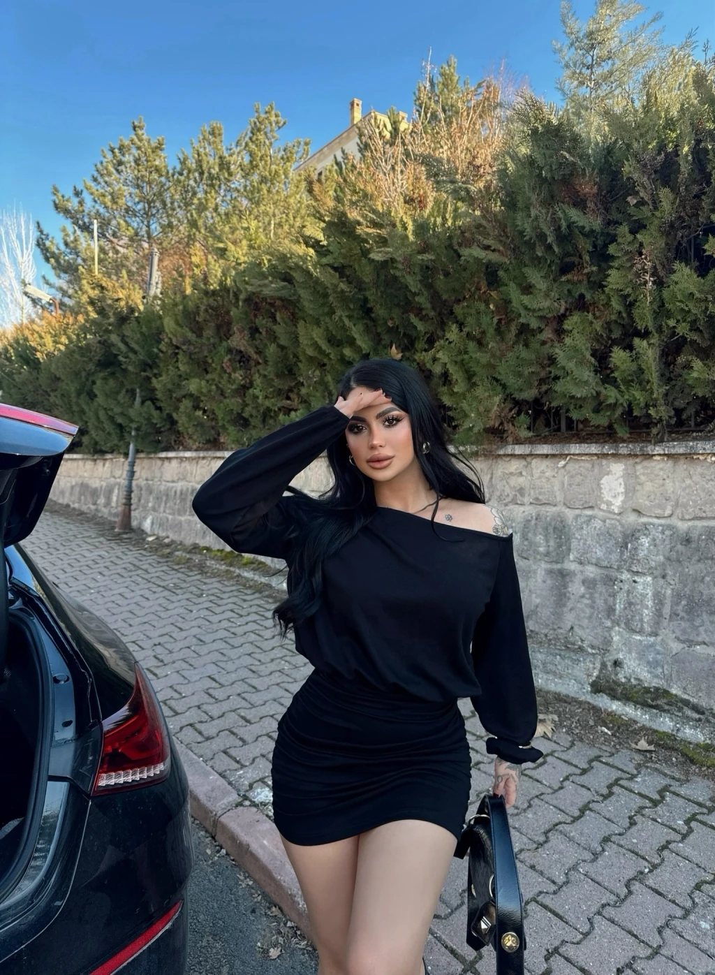 Siyah Katlamalı Kaşkorse Madonna Elbise