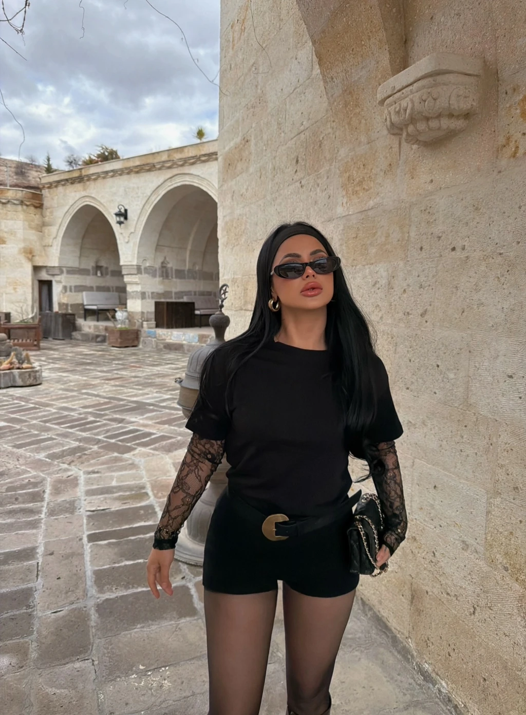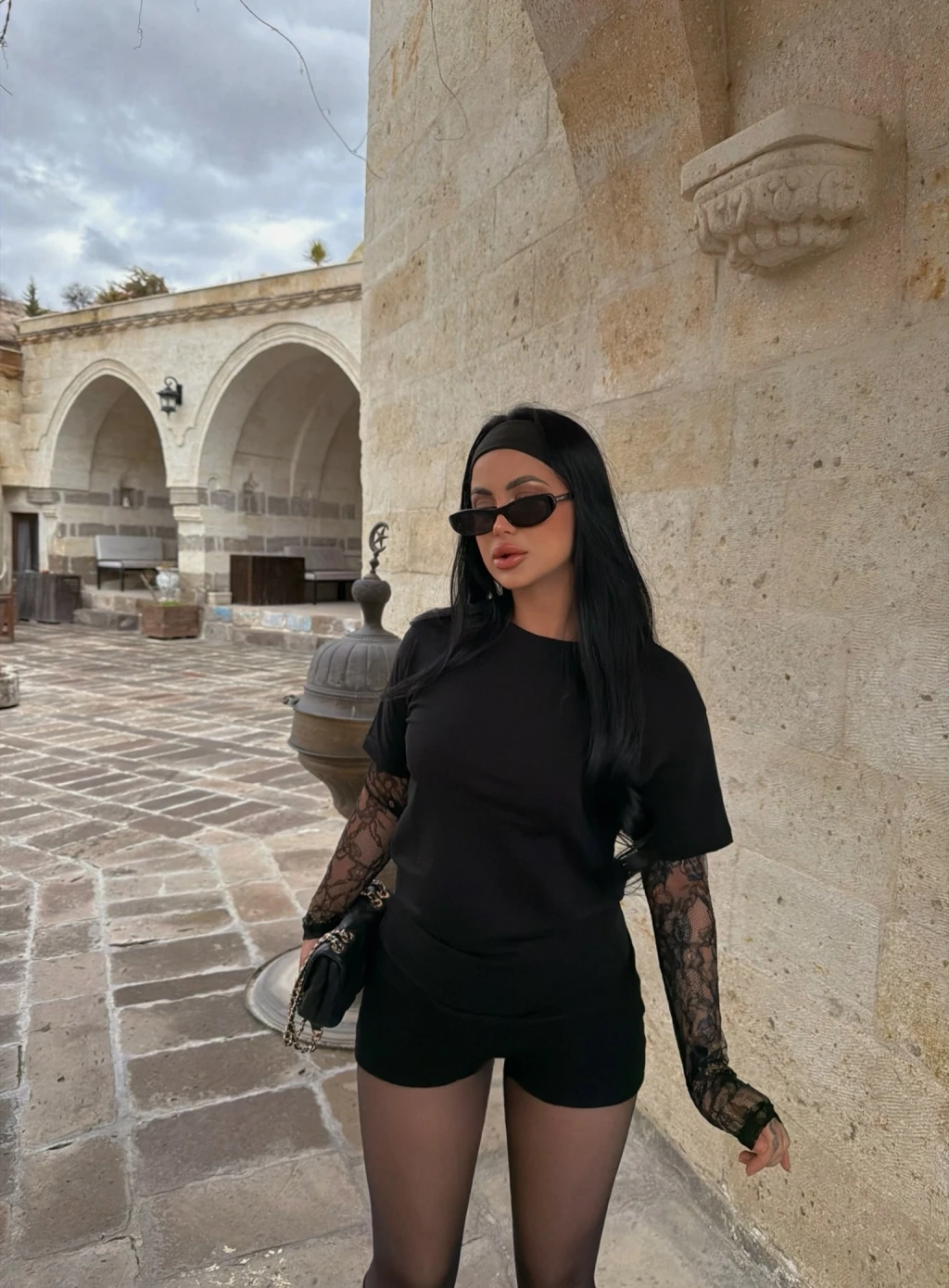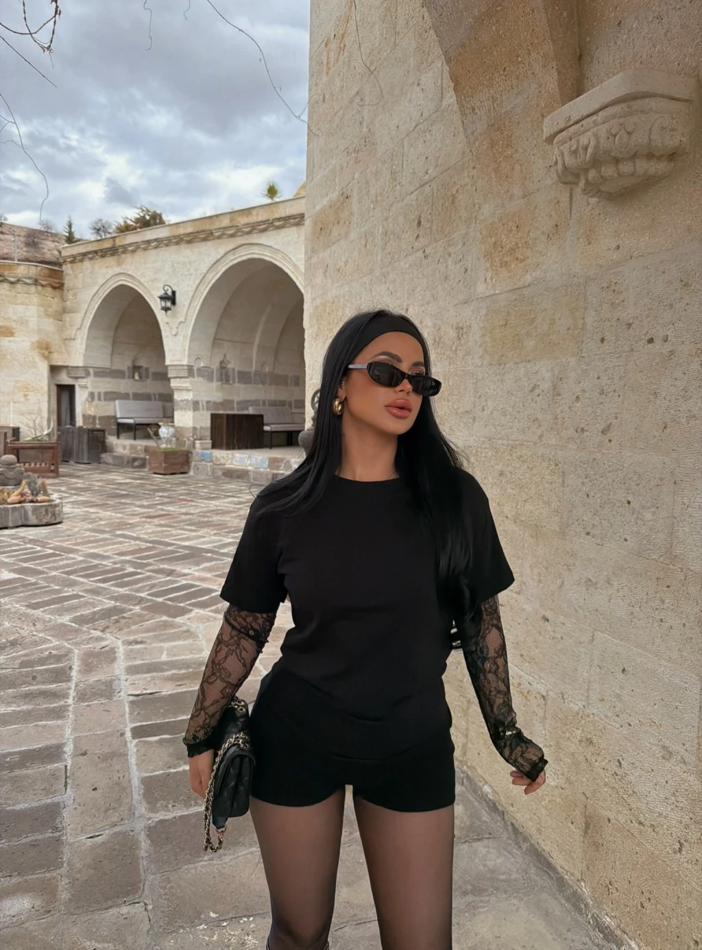 Siyah Kolları Güpürlü Basic Tişört