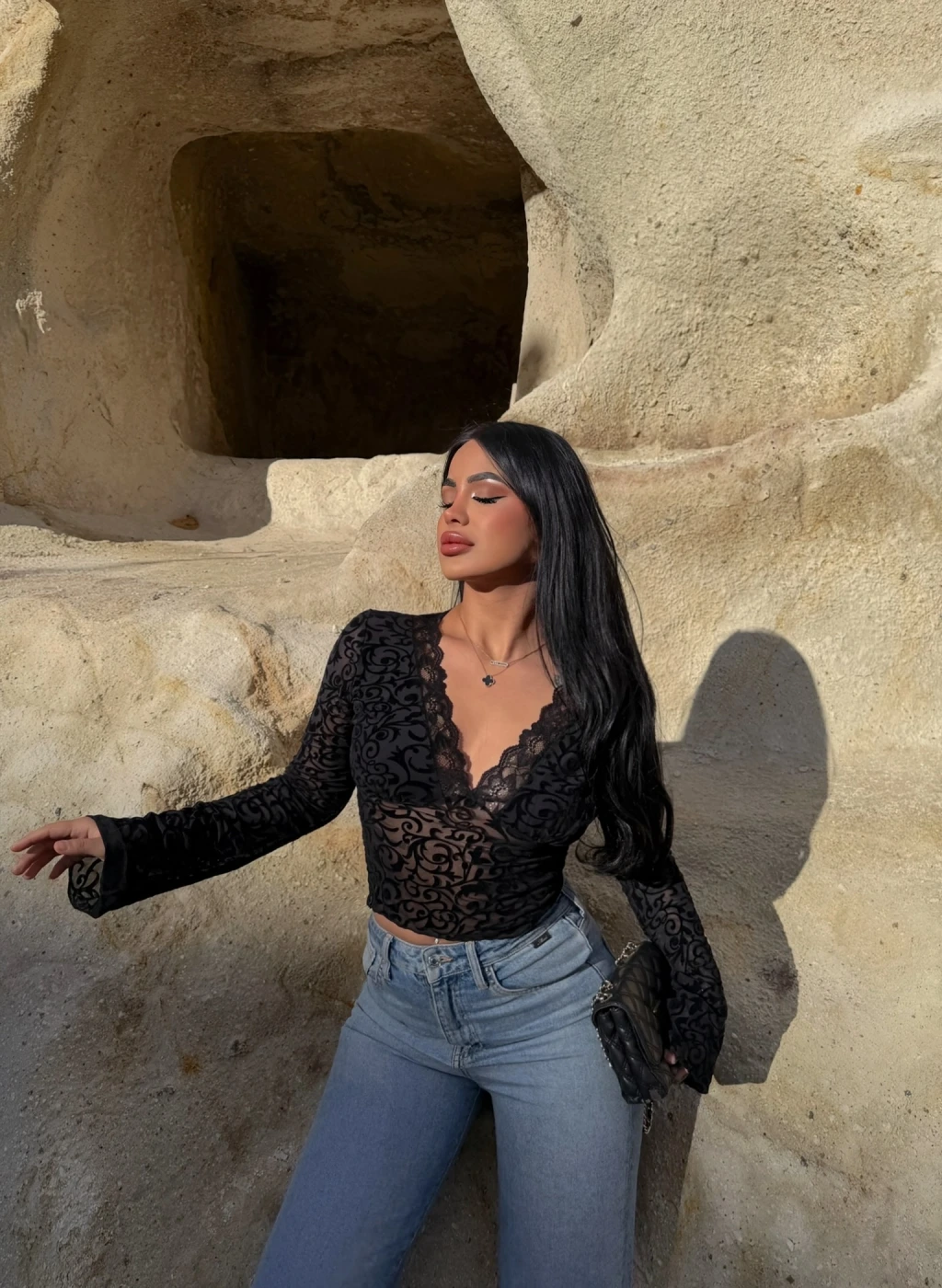 Siyah Noir Yaka Güpürlü Bluz