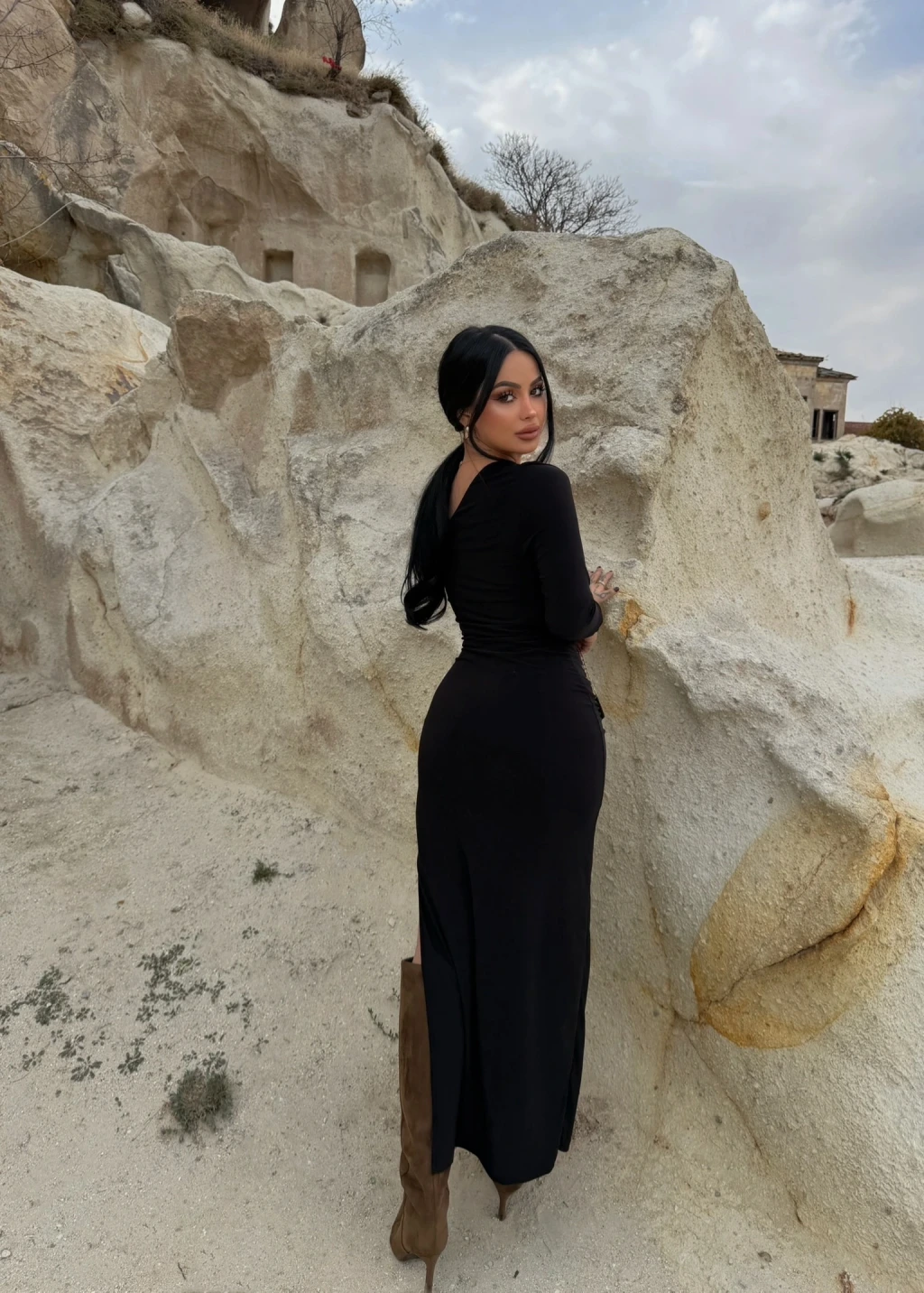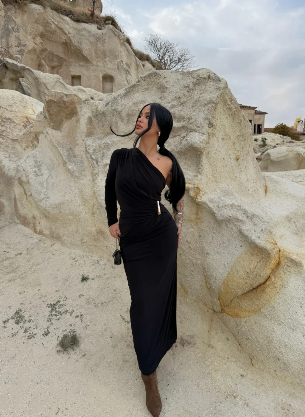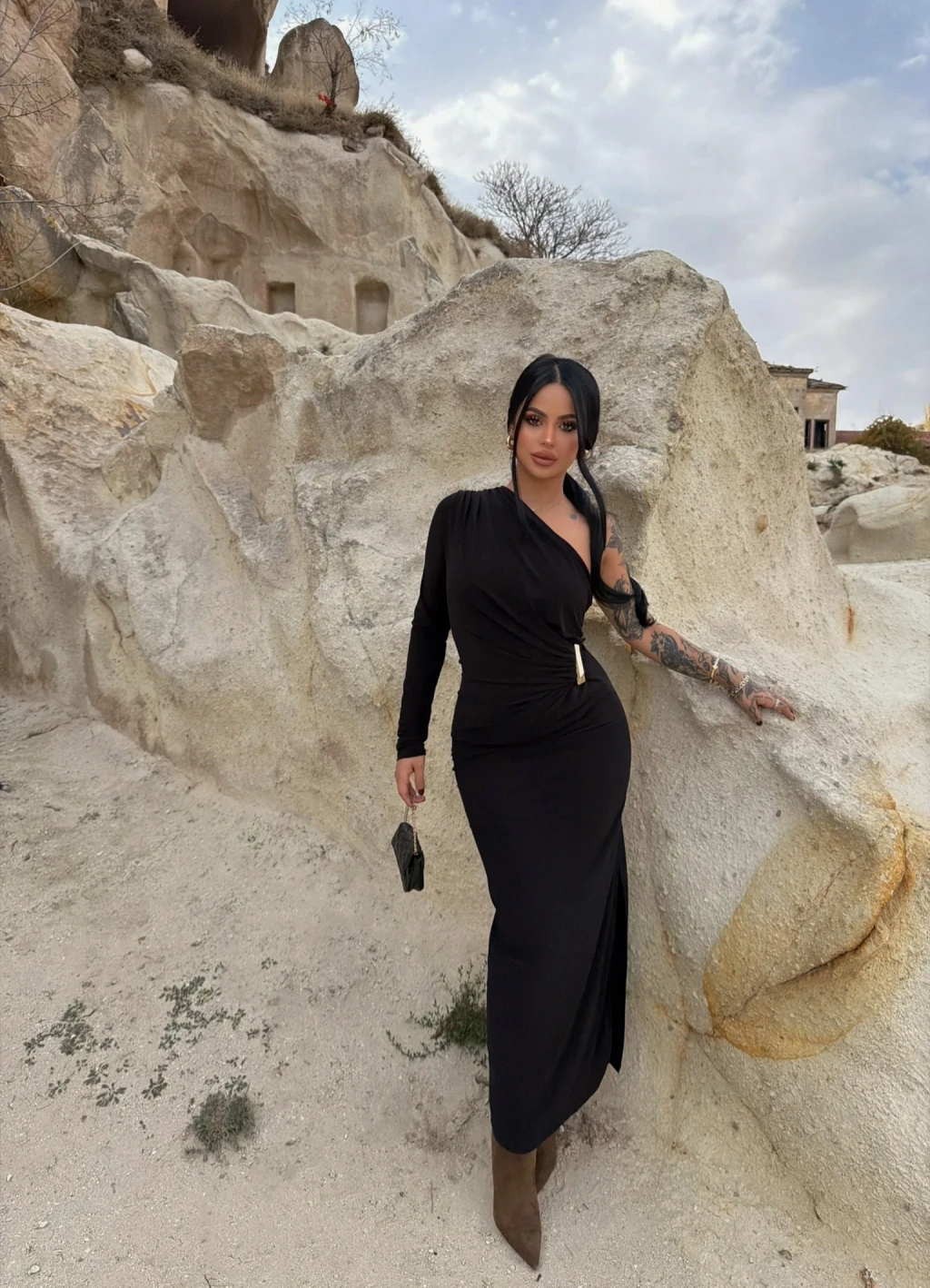 Siyah Omuz Drapeli Aksesuarlı Elbise