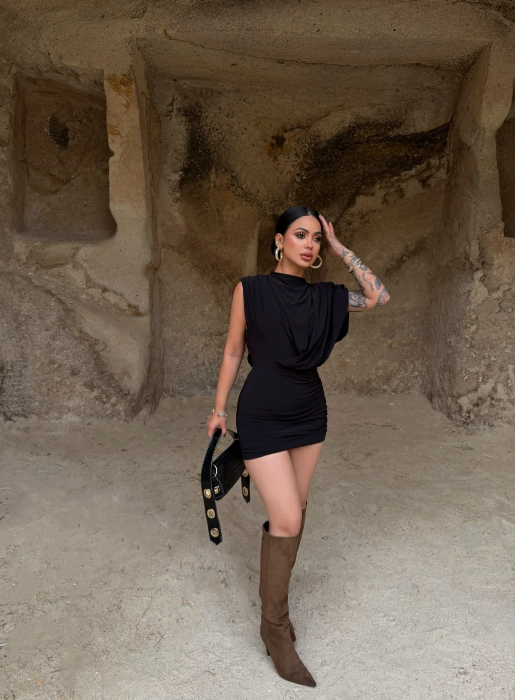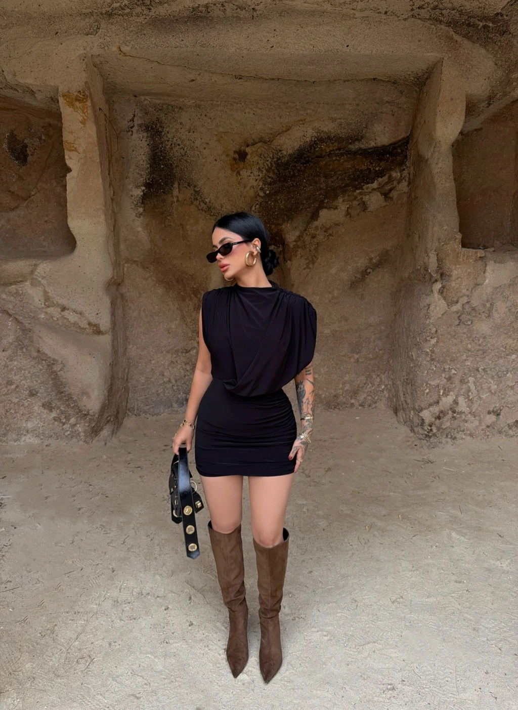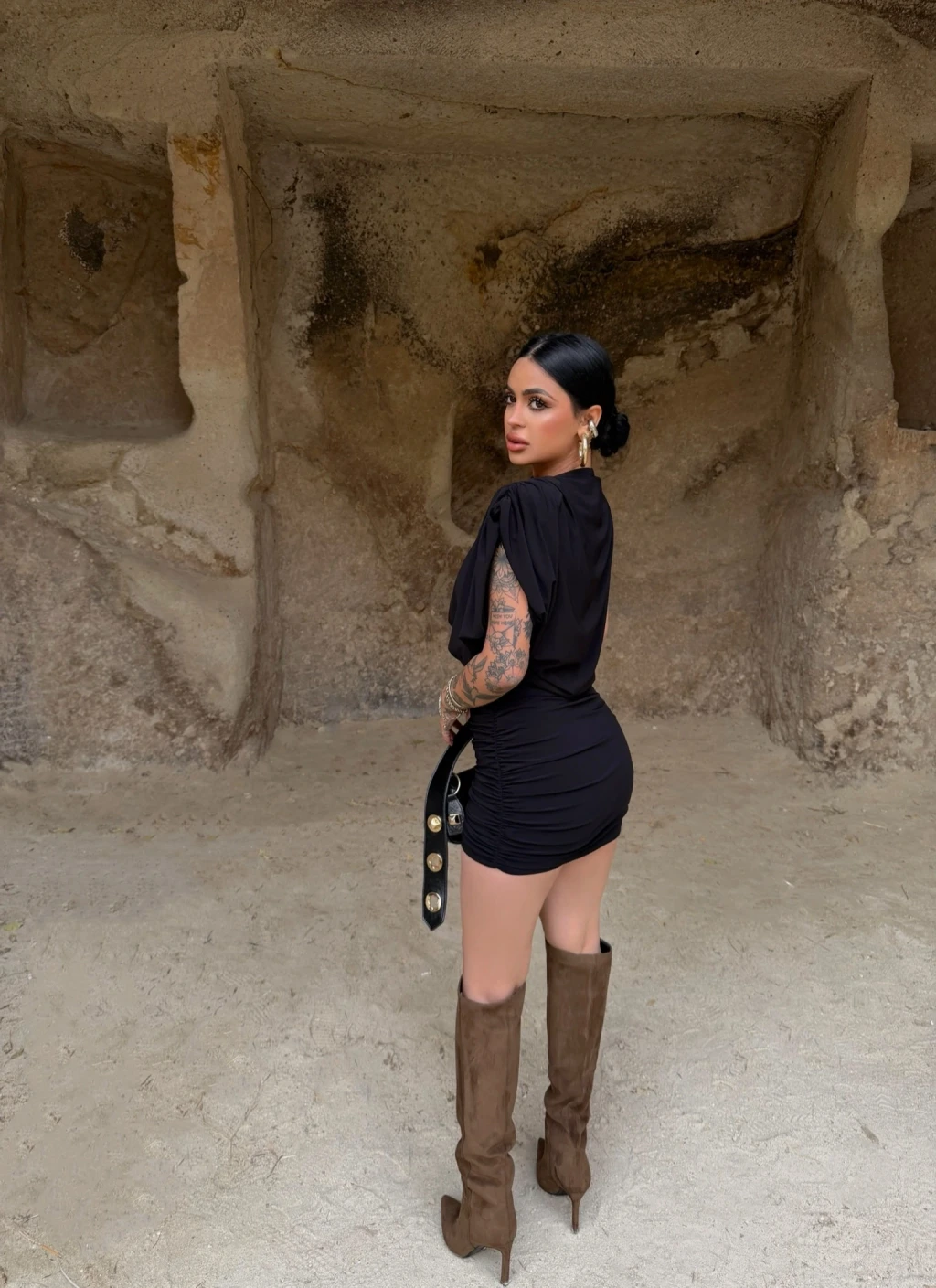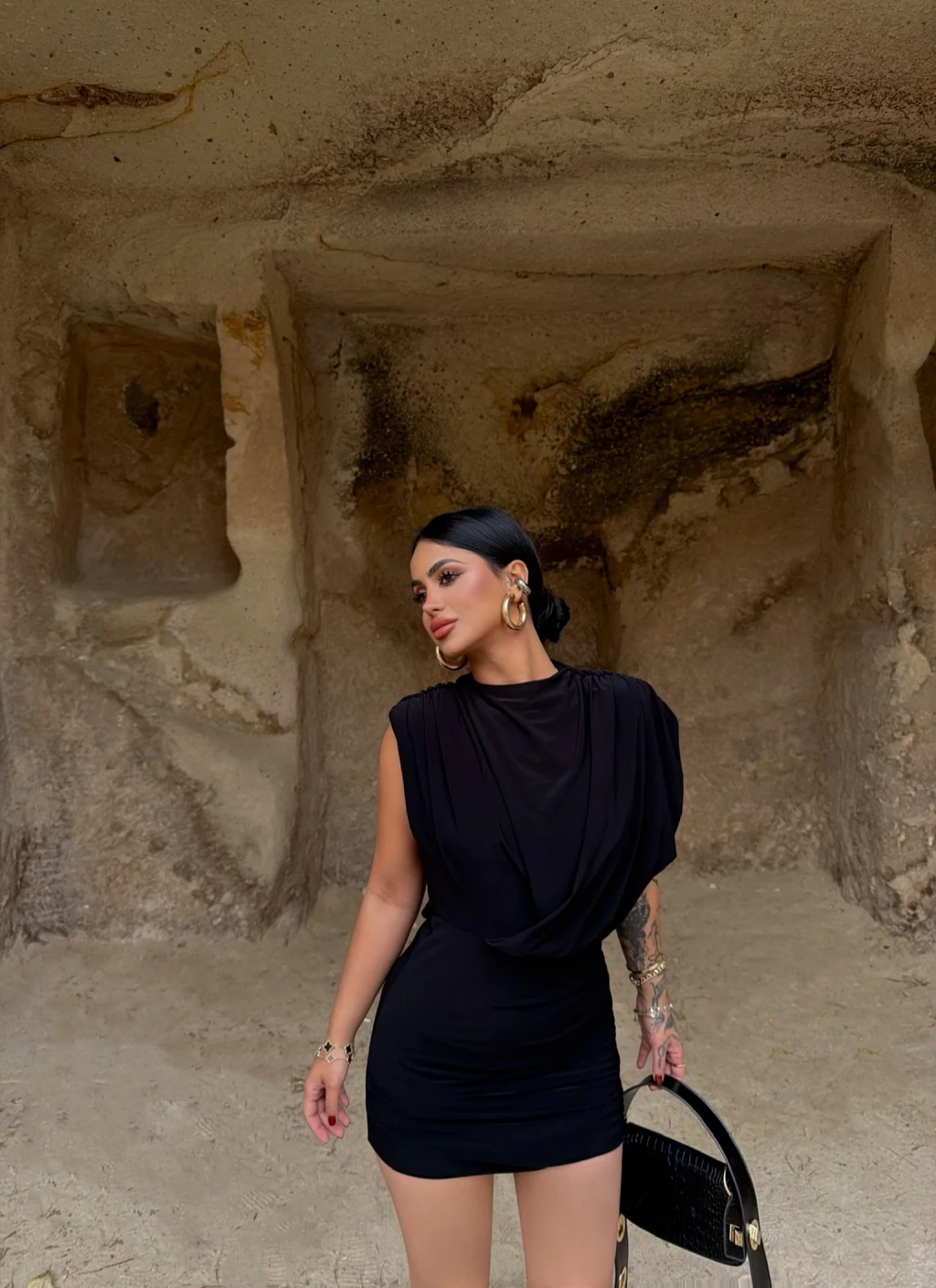 Omuz Vatkalı Büzgülü Sandy Elbise, şıklığı ve rahatlığı bir arada sunuyor. Kırmızı Butik'in özel tasarımı olan bu mini elbise, iddialı görünümüyle dikkat çekiyor.