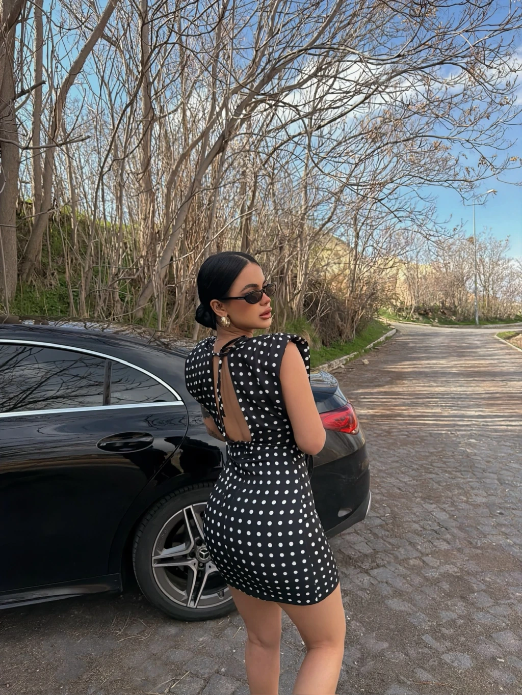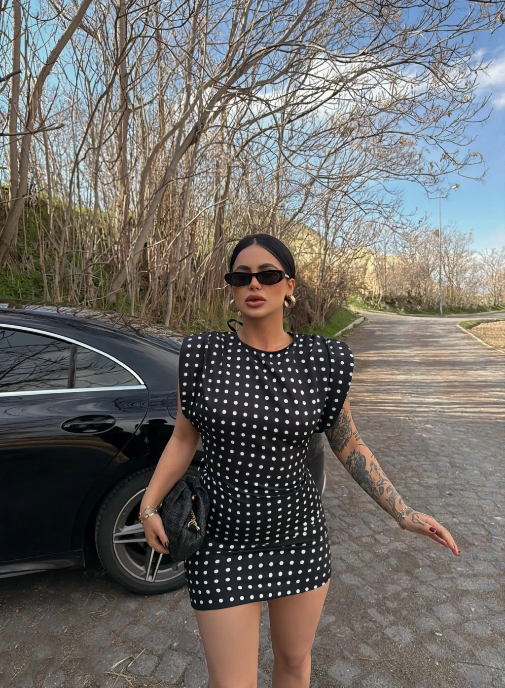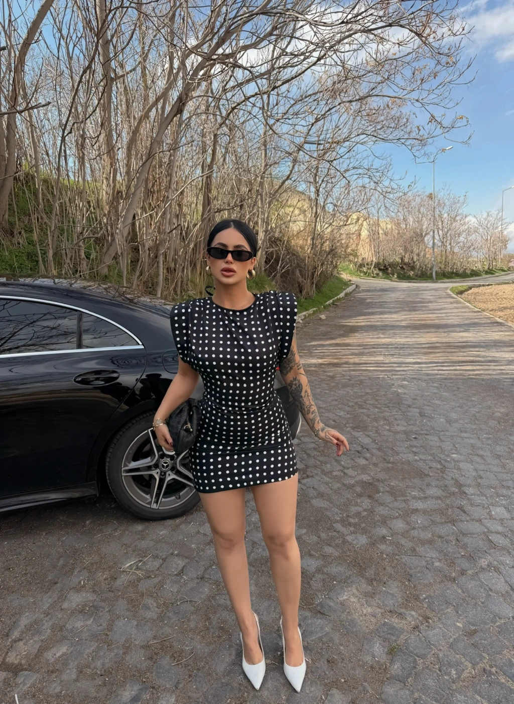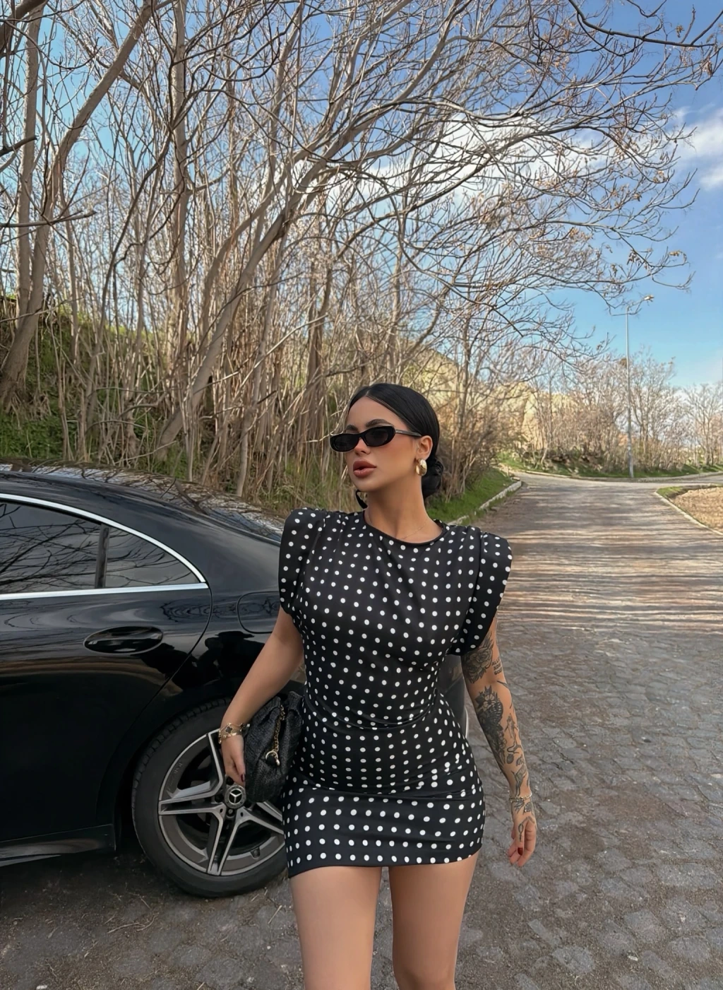 - Bu sezonun trendi olan puantiye desenli mini elbise.