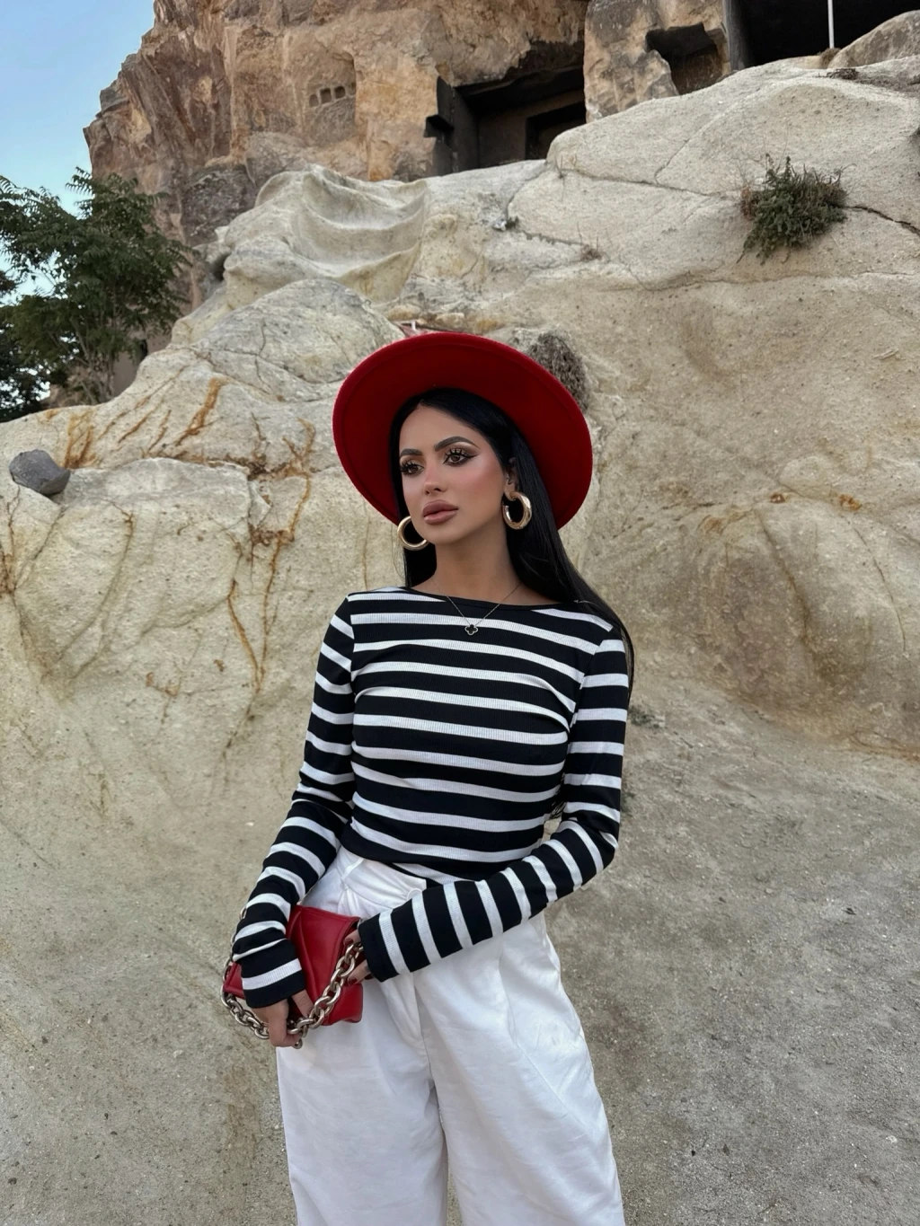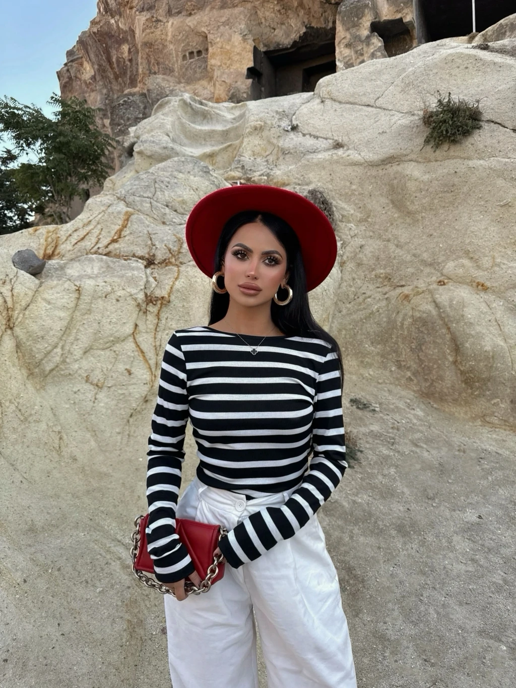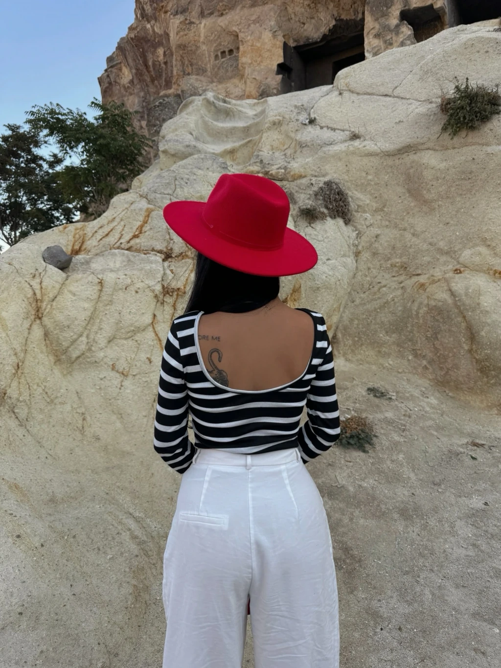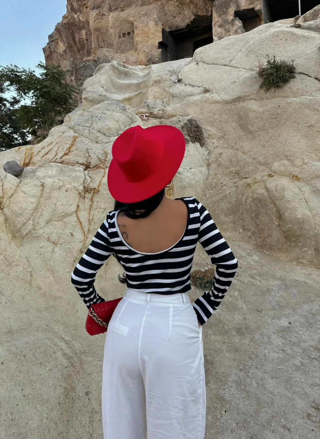 Kırmızı Butik'in sırt açık çizgili trikosuyla şıklığı ve rahatlığı bir arada yaşayacaksınız.