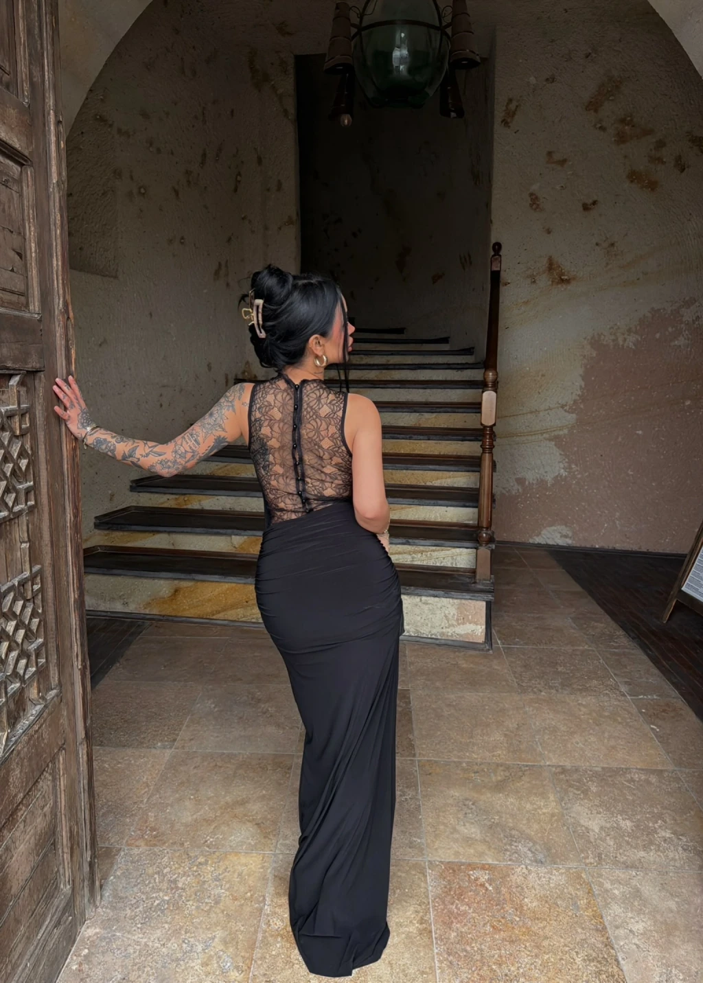 - Sırt kısmında bulunan düğme detayı, elbiseye modern bir hava katar.