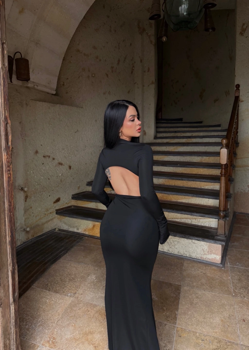 Sırt tarafındaki pencereli detayıyla modern bir hava katan elbise, özel davetlerde ve günlük hayatta şıklık vurgusu yapar.