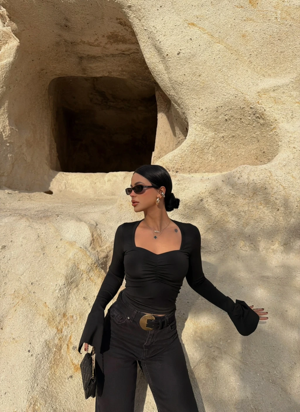 • Yaka kısmında bulunan büzgüler ile feminen bir hava yaratır.