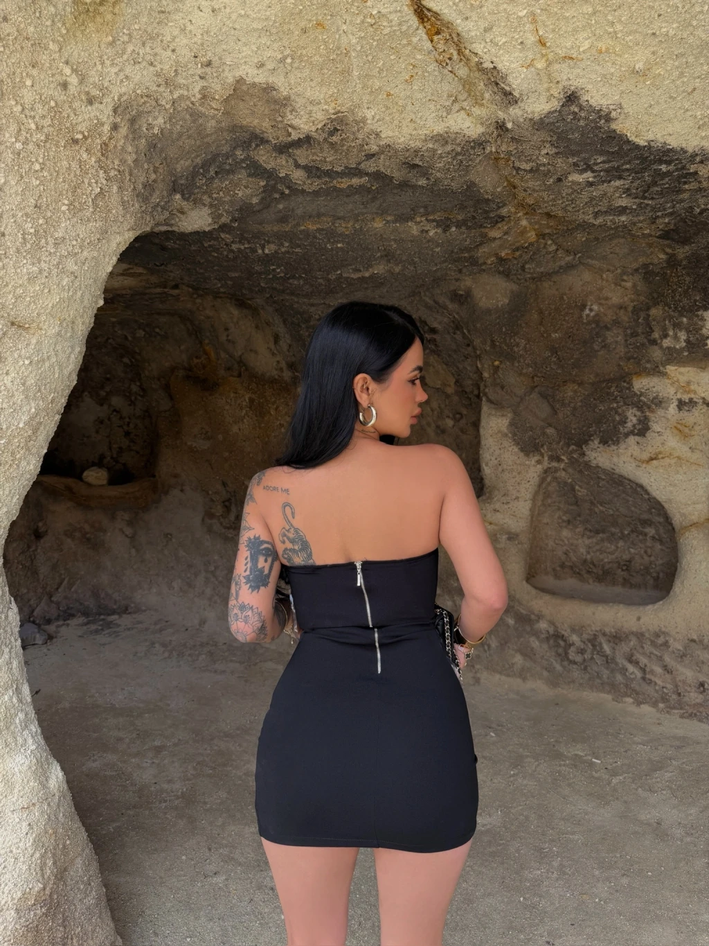 Yakası Tüy Straplez Elbise, Kırmızı Butik'in mini elbise kategorisindeki şık ve iddialı parçalarından biridir.