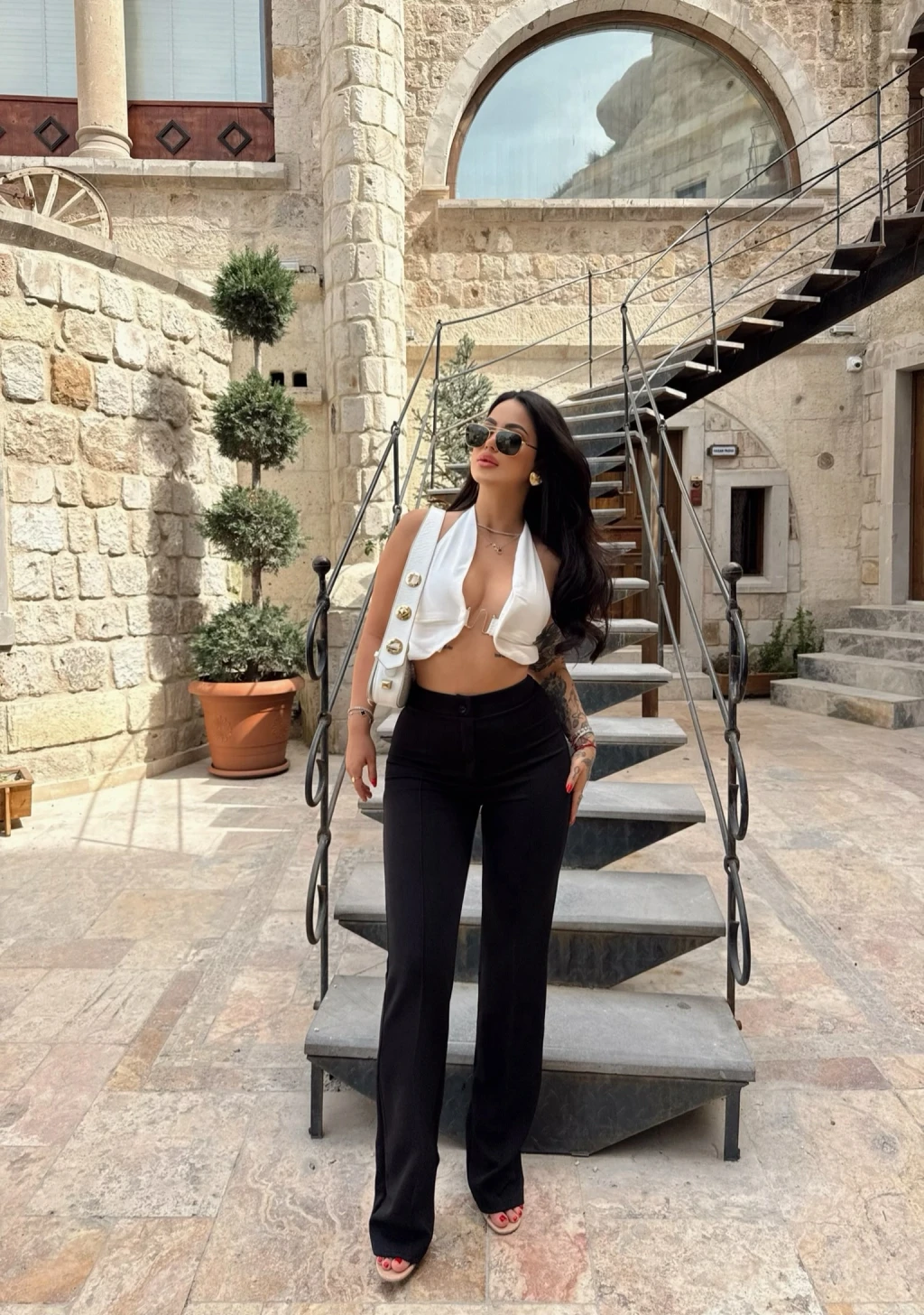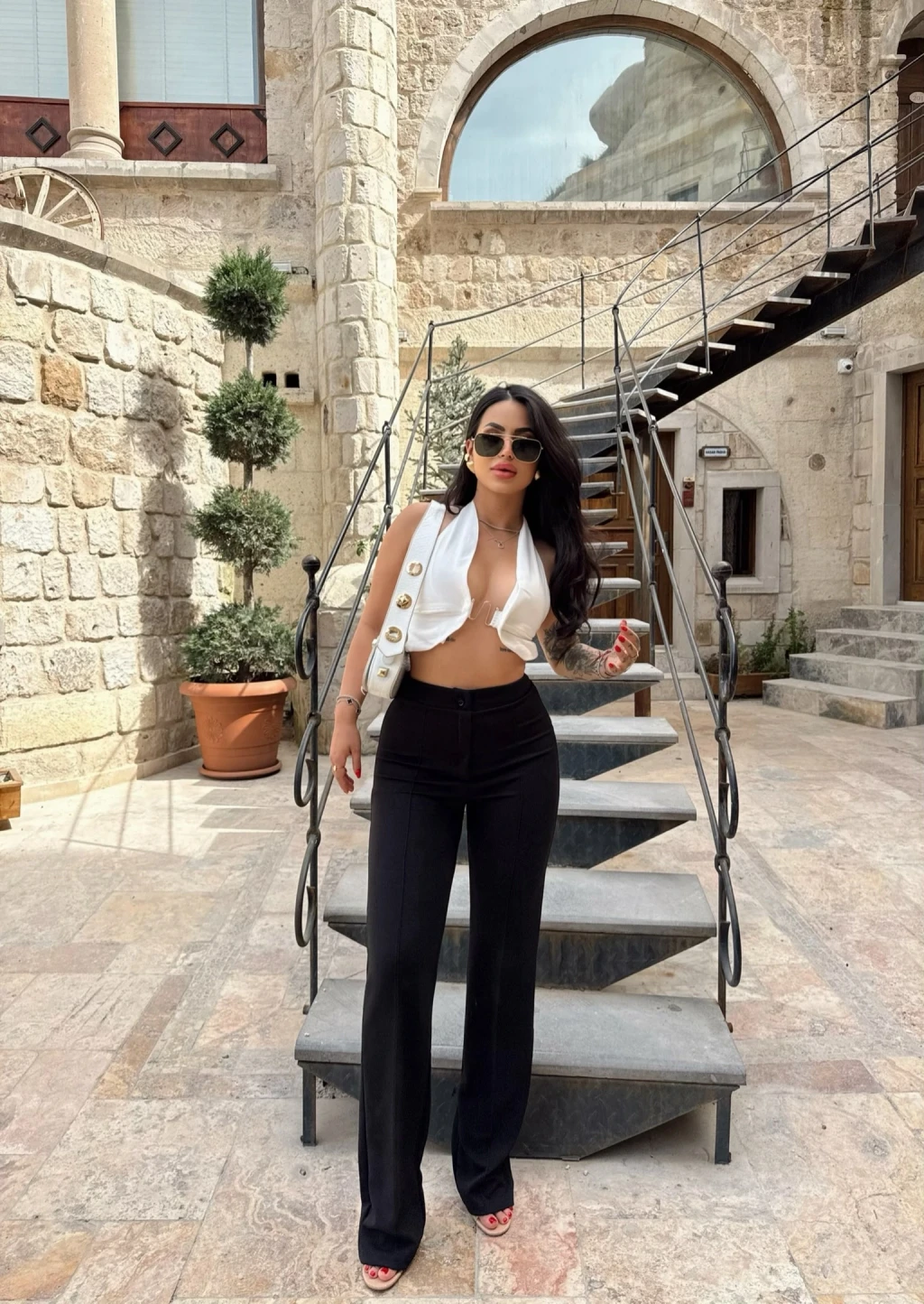 İnce bel kısmı ve geniş paçasıyla vücudu saran bu pantolon, her beden tipine uyum sağlar.