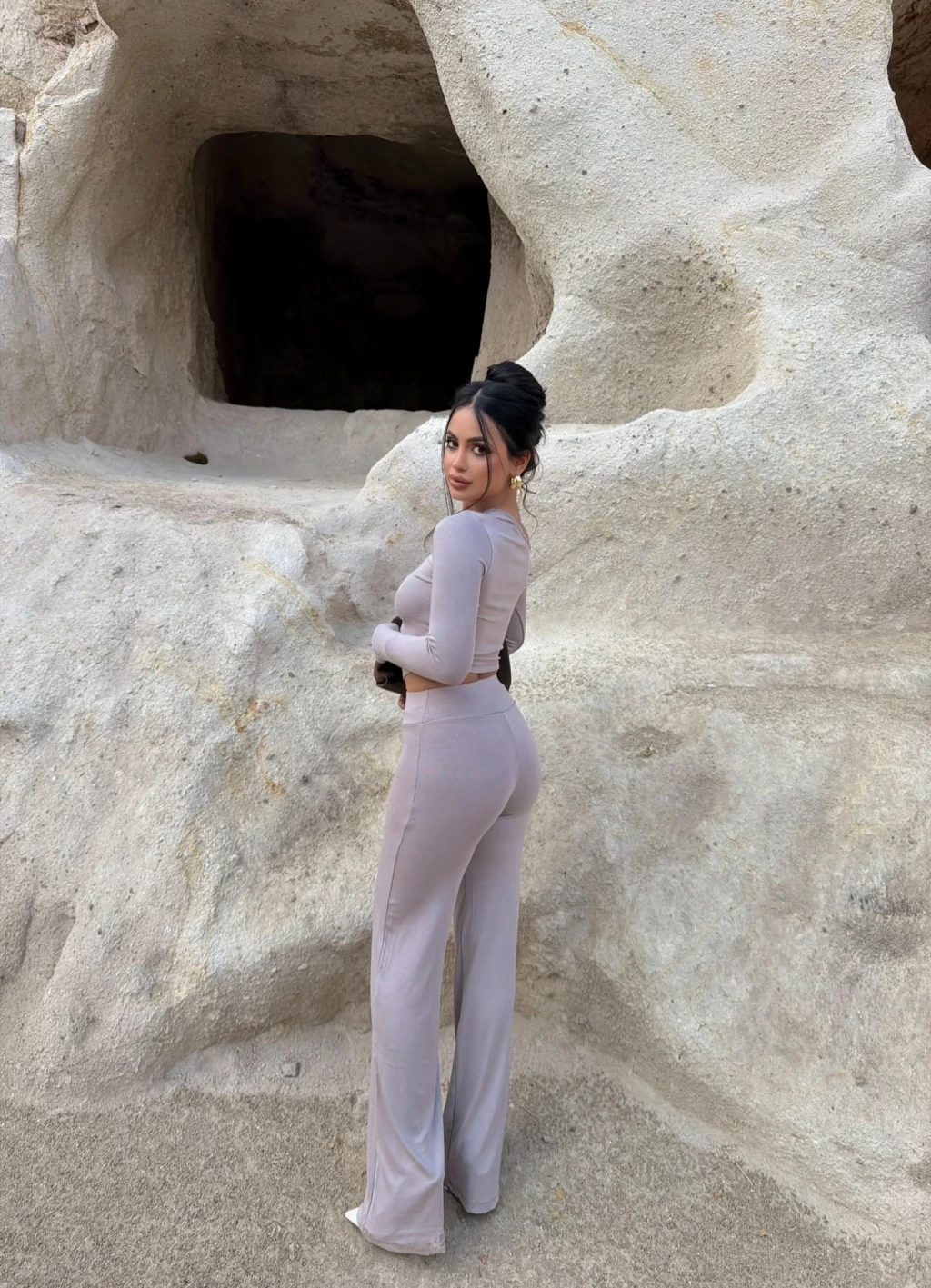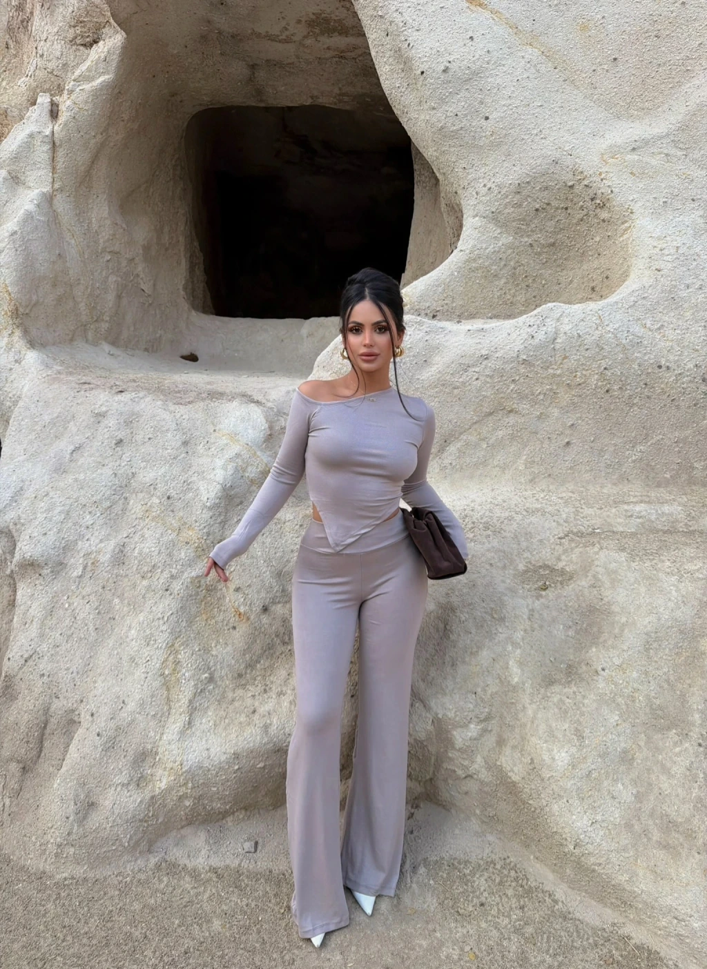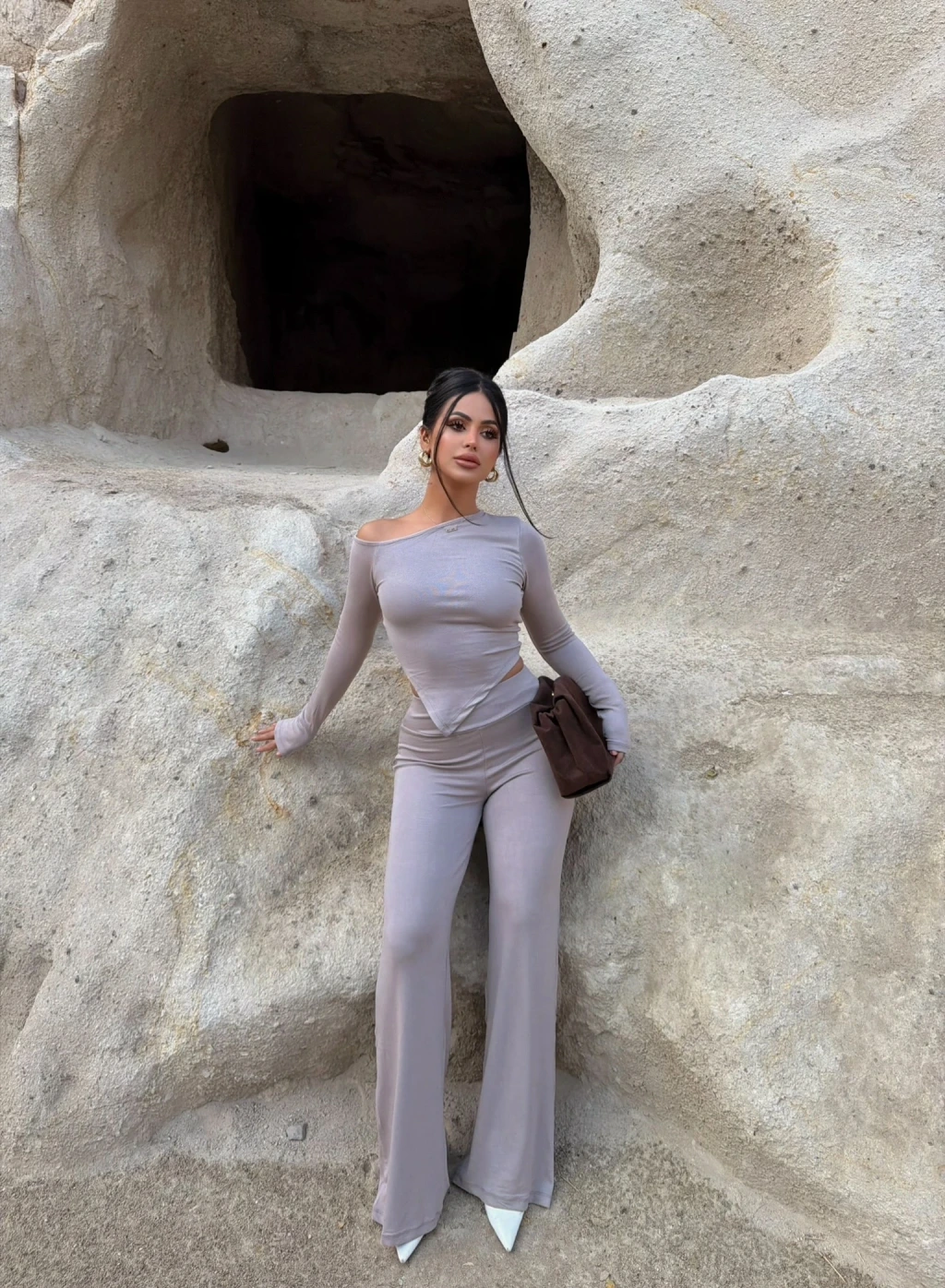 • Kayık yaka bluz ve buzlu keten pantolon kombinasyonundan oluşur