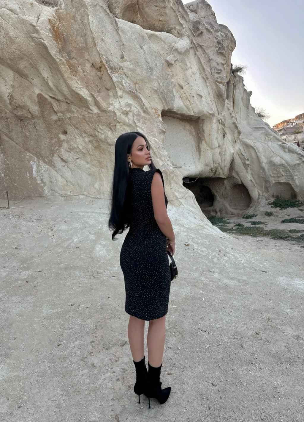 Kırmızı Butik'in şıklığı ve zarafeti bir araya getiren Taşlı Dik Yaka Elbise, özel davetlerde ve gecelerde göz kamaştırmak için ideal bir seçenektir.