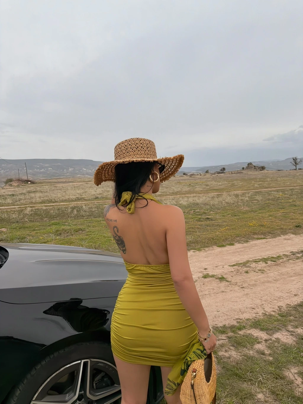 Boyundan bağlama detayı ile fark yaratan elbise, tokalı tasarımıyla da modern bir hava katmaktadır.