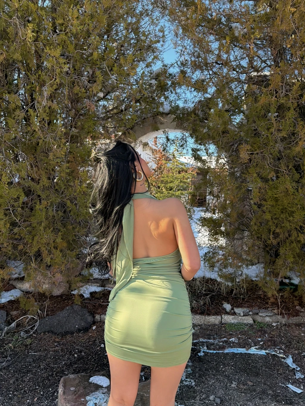 Boyundan bağlama detayı ile fark yaratan elbise, tokalı tasarımıyla da modern bir hava katmaktadır.